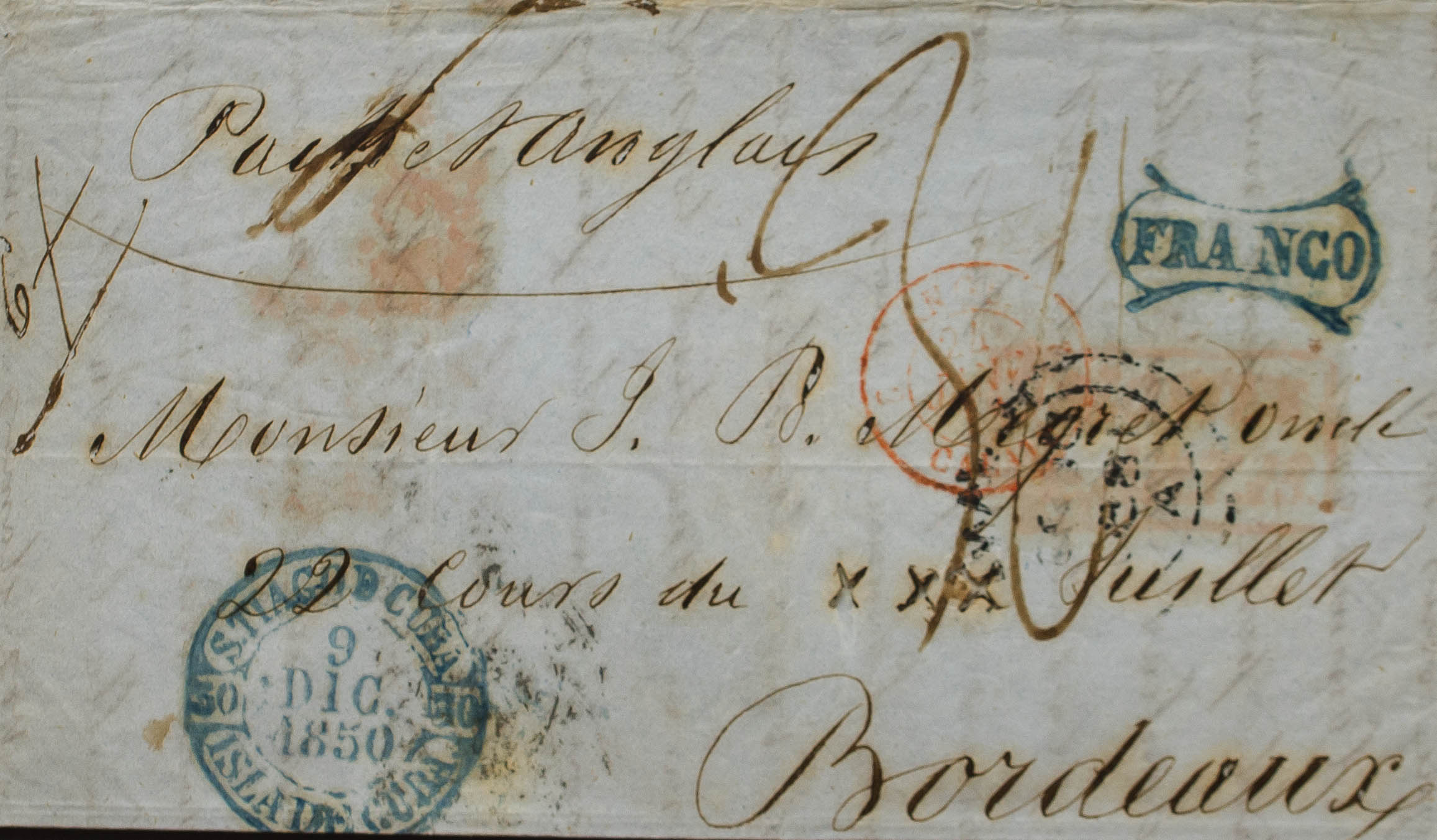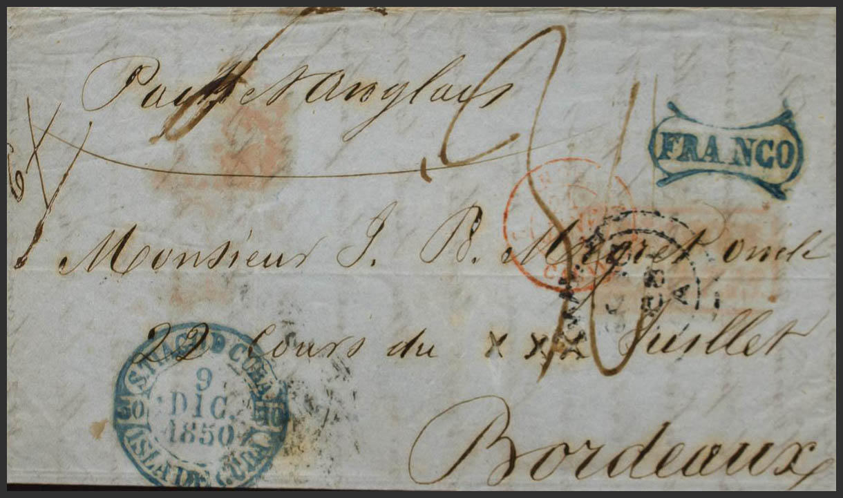 1851. SANTIAGO DE CUBA a BURDEOS (FRANCIA). Baeza STIAGO DE CUBA / ISLA DE CUBA, marca FRANCO, en azul (P.E.9) edición 2004 y fechador de doble arco HAVANA, de la Agencia Postal Británica aplicado en tránsito (estampado también al dorso). MAGNIFICA Y MUY RARA.