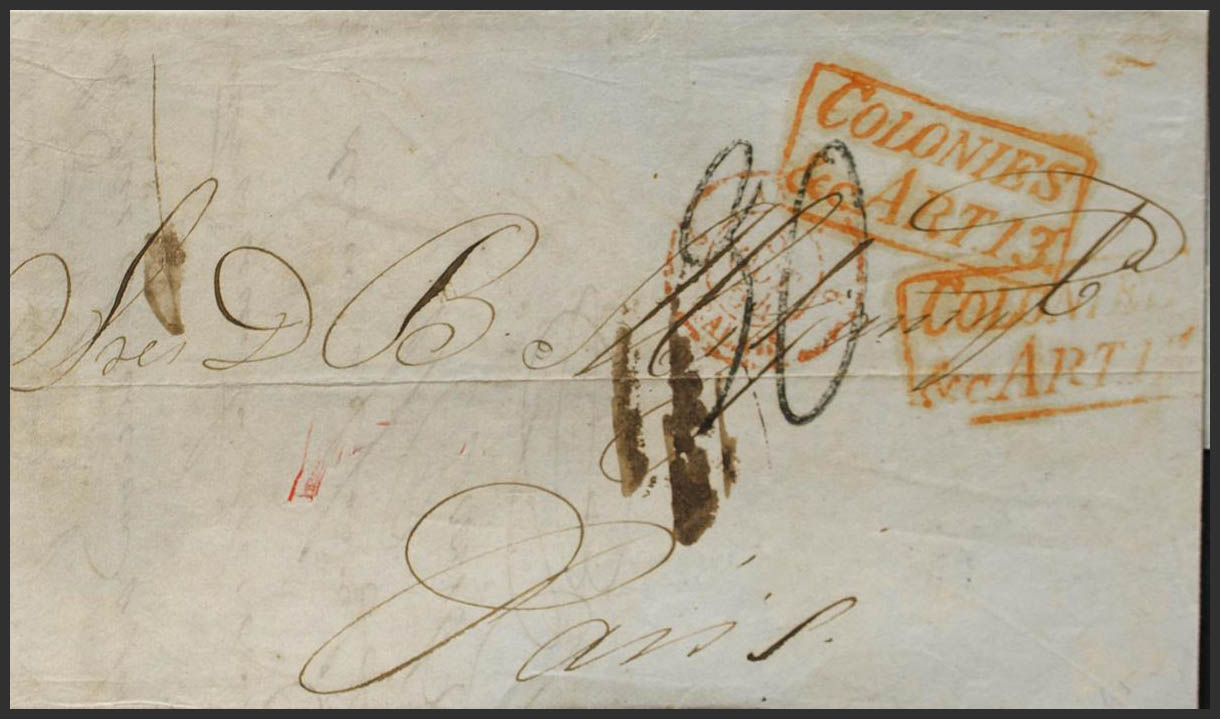 1854. LA HABANA a PARIS (FRANCIA). Marca COLONIES / AND C.ART.13, en rojo (estampada dos veces) y porteo francés "30", al dorso fechador HAVANA, de la Agencia Postal Británica (P.E.75) edición 2004. MAGNIFICA.