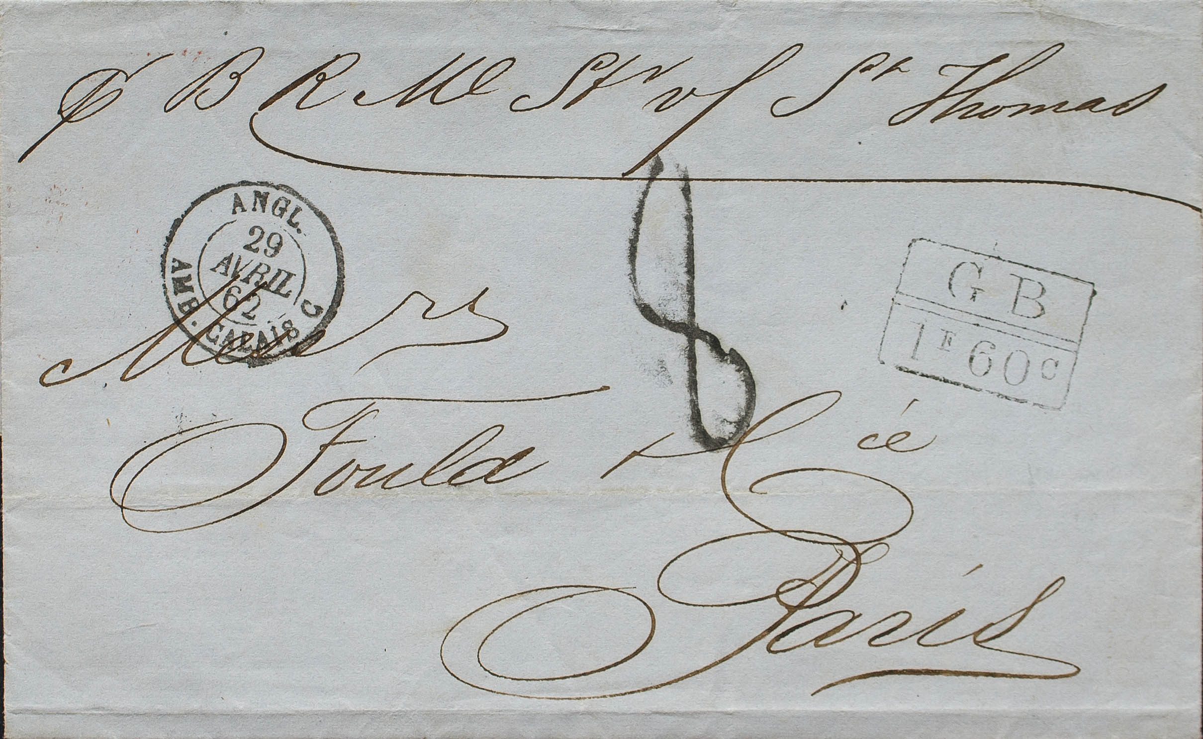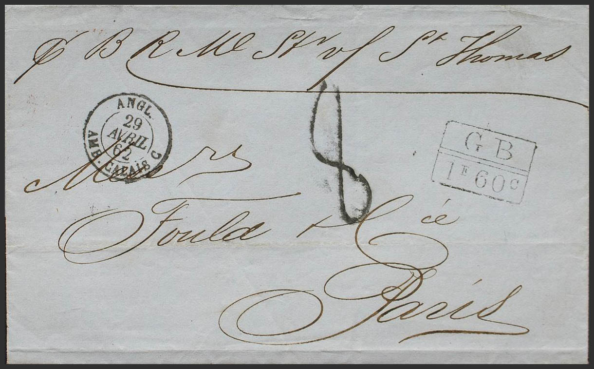 1862. LA HABANA a PARIS. Marca de intercambio franco-británica G.B. / 1F 60C, porteo francés "8" y manuscrito "Pr B.R.M. Str. of St. Thomas", al dorso fechador HAVANA, de la Agencia Postal Británica en Cuba (P.E.75) edición 2004. MAGNIFICA Y RARA.