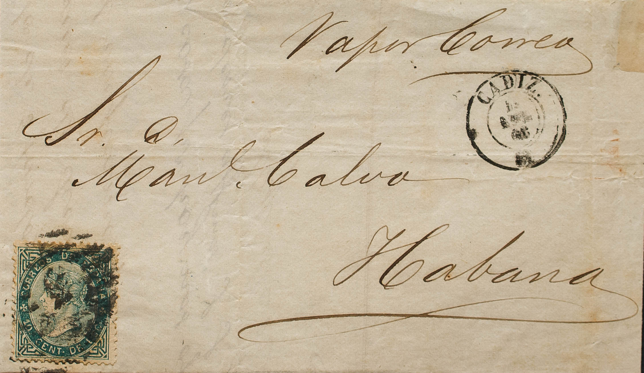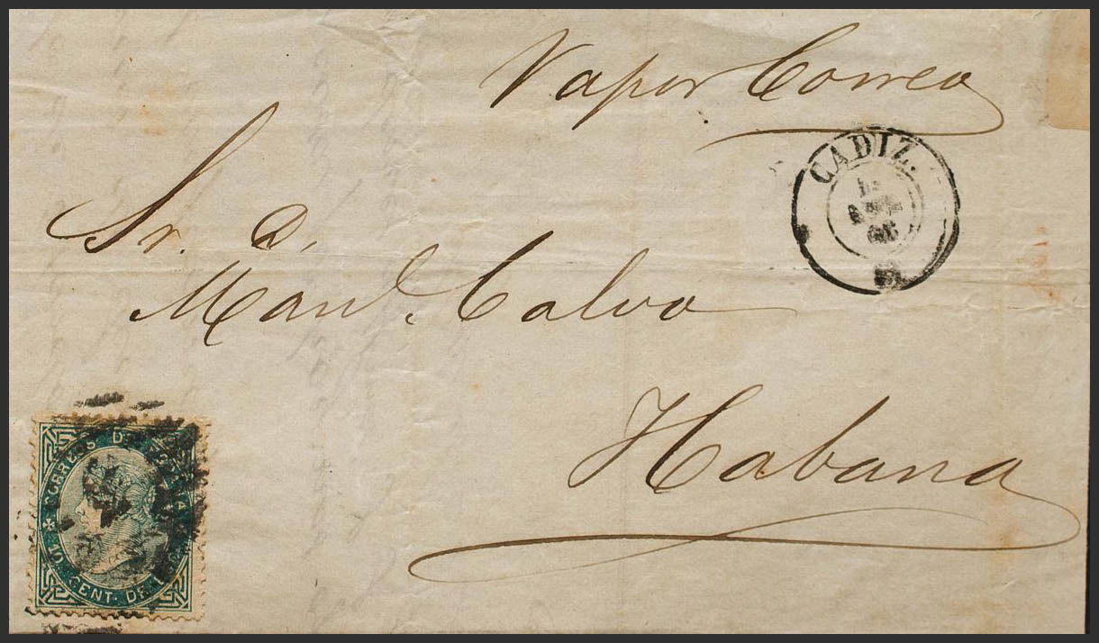 91. 1868. 10 cts verde. CADIZ a LA HABANA. MAGNIFICA.