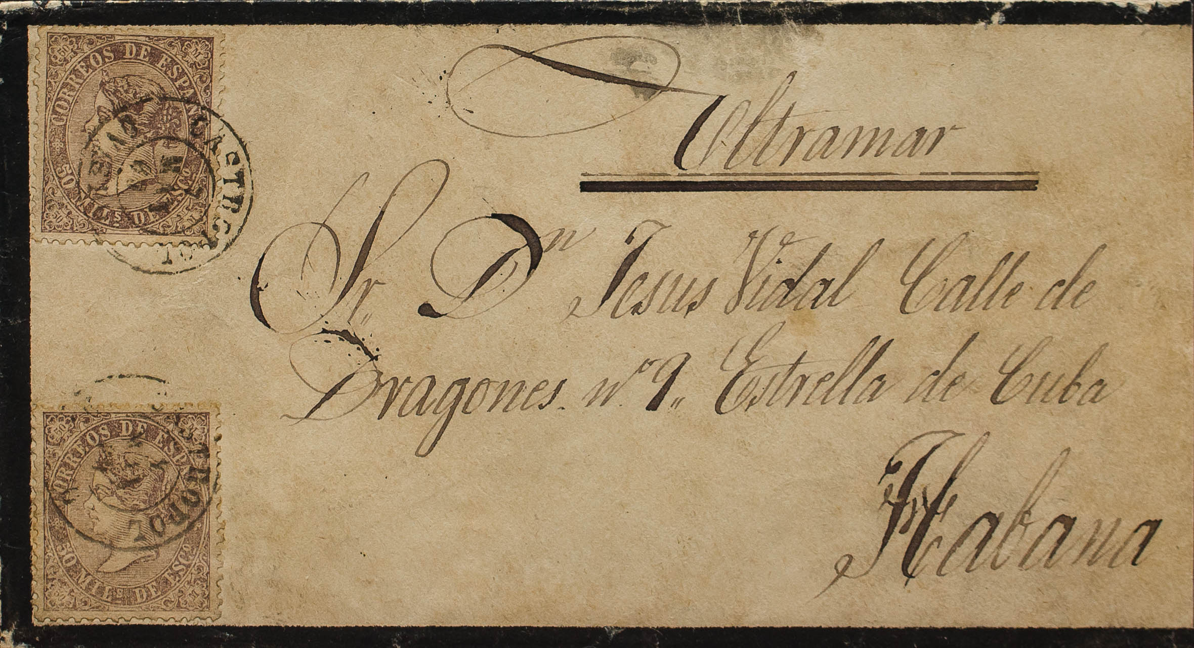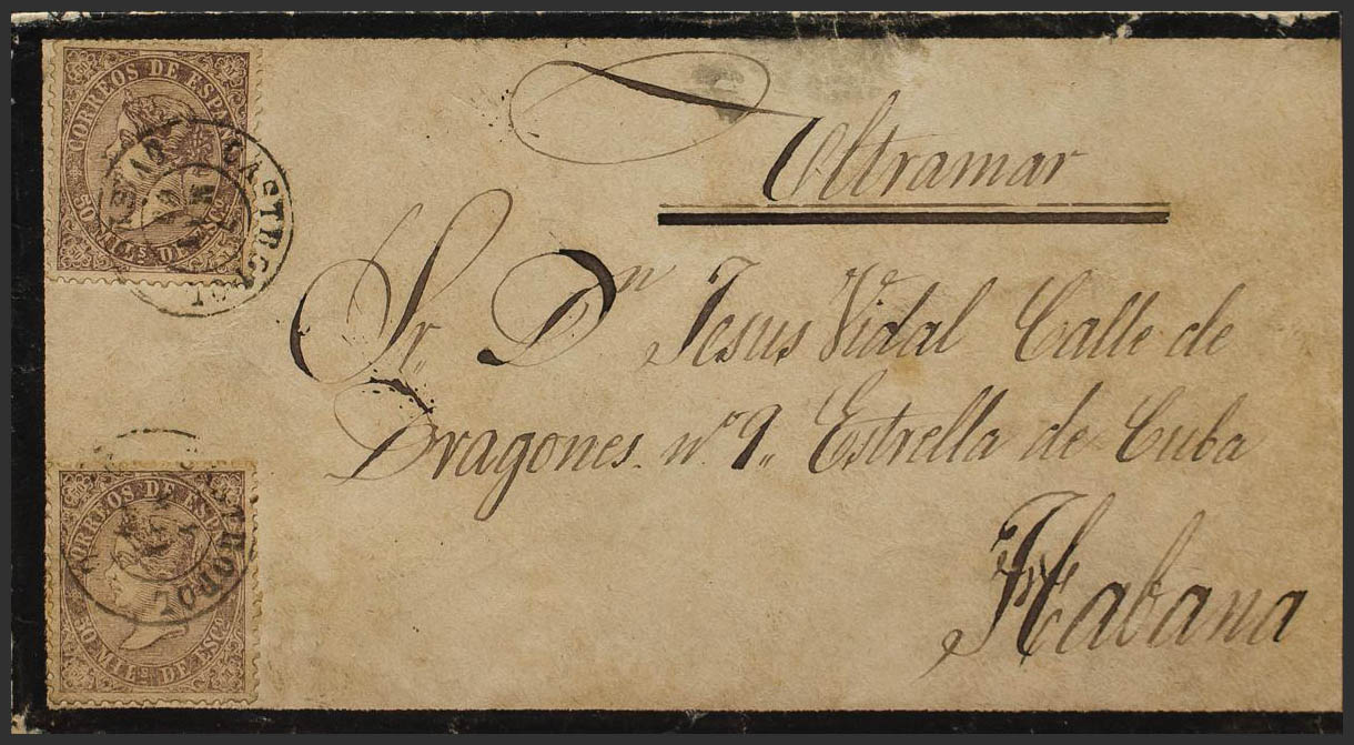 98(2). 1869. 50 mils violeta, dos sellos. CASTROPOL a LA HABANA (CUBA). Matasello CASTROPOL / OVIEDO. MAGNIFICA E INUSUAL COMBINACION DE FRANQUEO PARA COMPONER LOS 100 MILS A CUBA.
