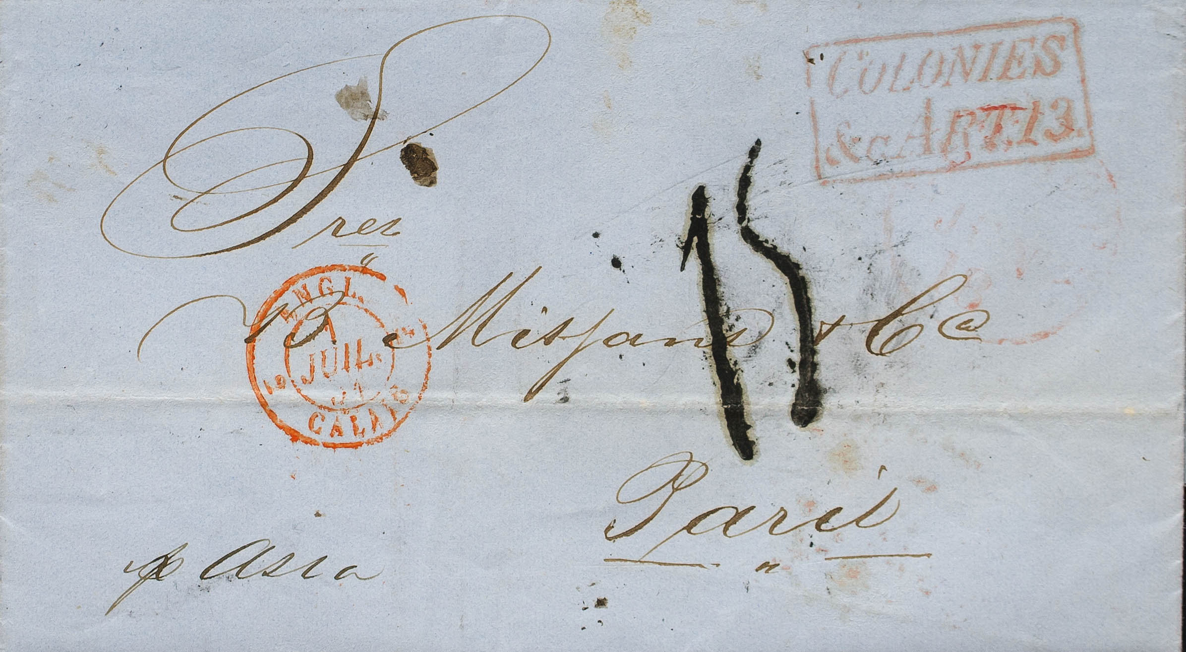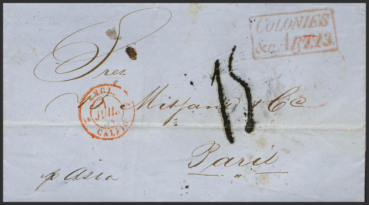 1851. LA HABANA a PARIS (FRANCIA), encaminada vía Nueva York por el agente DENISTOUN WOOD AND Cº (marca al dorso). Marca COLONIES AND C.ART.13 y porteo francés "15", transportada a bordo del Vapor "Asia", de la Linea Cunard. MAGNIFICA Y RARA.