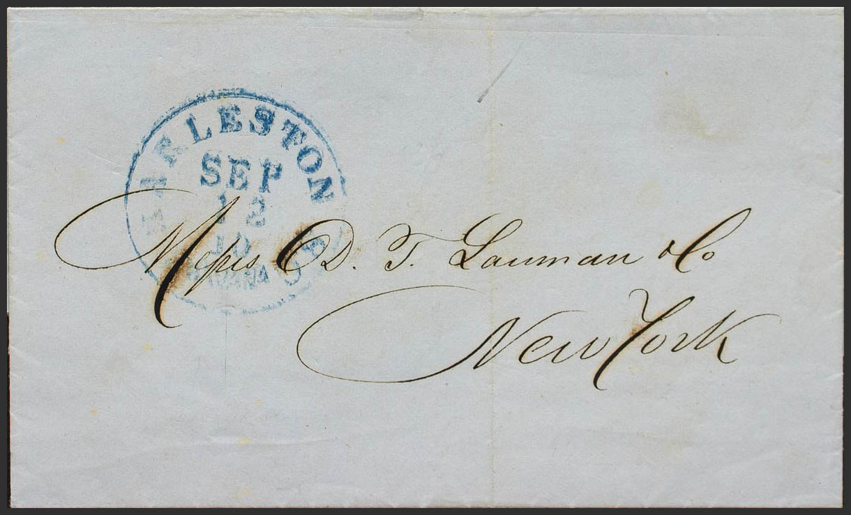 1854. LA HABANA a NUEVA YORK. Fechador CHARLESTON S.C. / HAVANA, en azul aplicado en tránsito. MAGNIFICA Y MUY RARA.