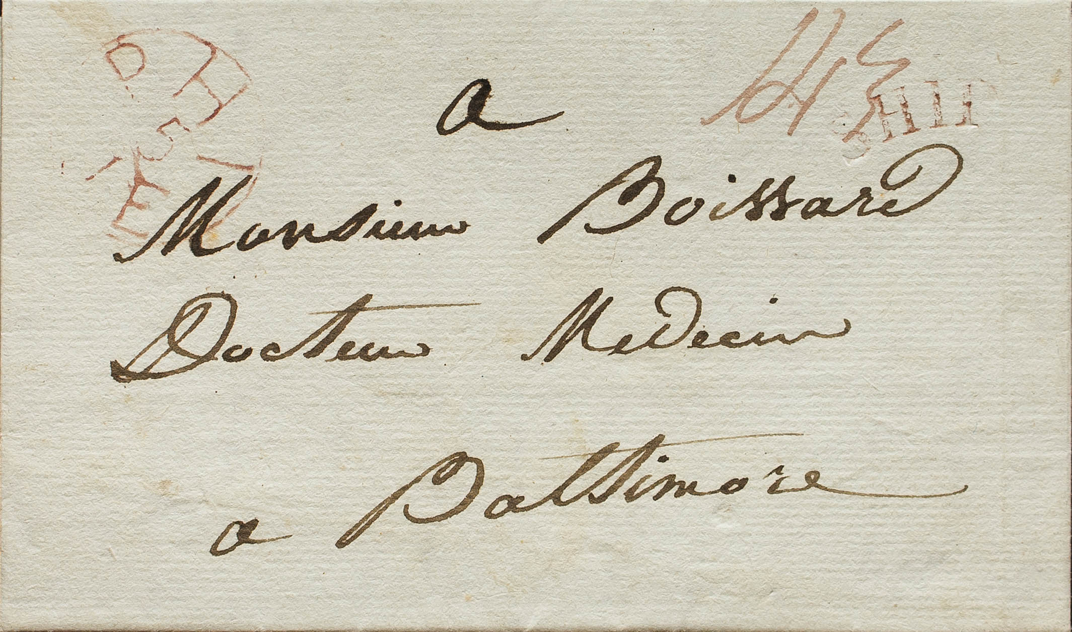 1805. SANTIAGO DE CUBA a BALTIMORE (U.S.A.). Circulada vía Philadelphia donde se aplica la marca SHIP y el fechador PHI / 5 / AP, en rojo carmín, además del porte manuscrito "14½". MAGNIFICA Y RARA.