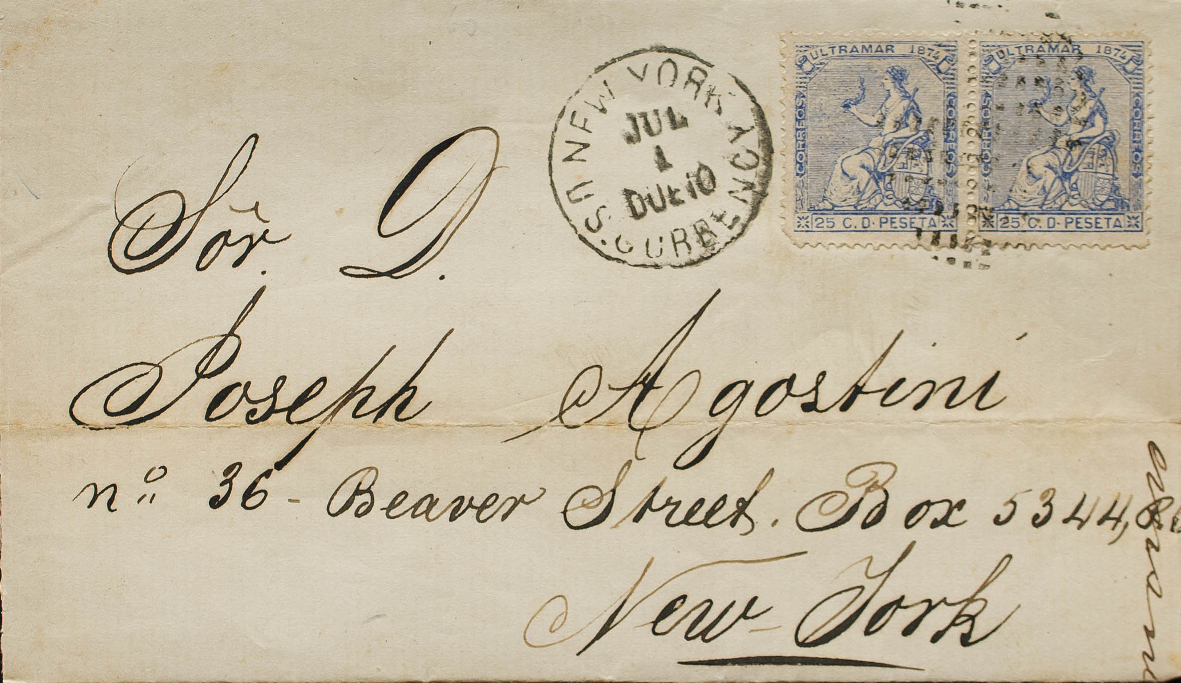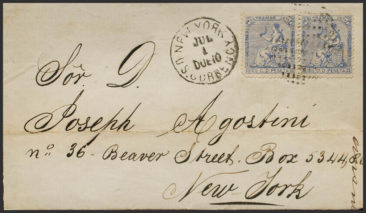 28(2). 1874. 25 cts ultramar, pareja. SANTIAGO DE CUBA a NUEVA YORK (U.S.A.). Matasello PARRILLA DE PUNTOS (circular) y en el frente fechador NEW YORK / DUE 10 / U.S. CURRENCY. MAGNIFICA Y RARA.