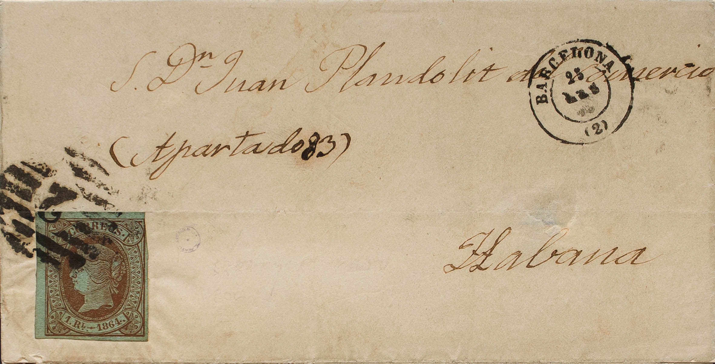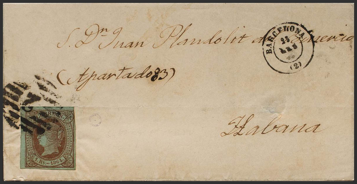 67. 1964. 1 real castaño. BARCELONA a LA HABANA. Matasello PARRILLA CON Nº2, de Barcelona. MAGNIFICA Y RARA.