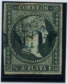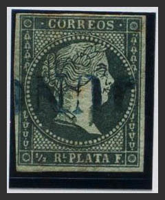 Ant.1. 1855. ½ real verde. Matasello prefilatélico JUNCOS, en azul. MAGNIFICO Y EXTRAORDINARIAMENTE RARO, PARA HACERNOS UNA IDEA DE LA RAREZA DEL MATASELLO, SEGUN TIZON LA MARCA ESTAMPADA SOBRE UNA CARTA SIN SELLO TIENE UNA RAREZA MAXIMA. Cert. ECHENAGUSIA.