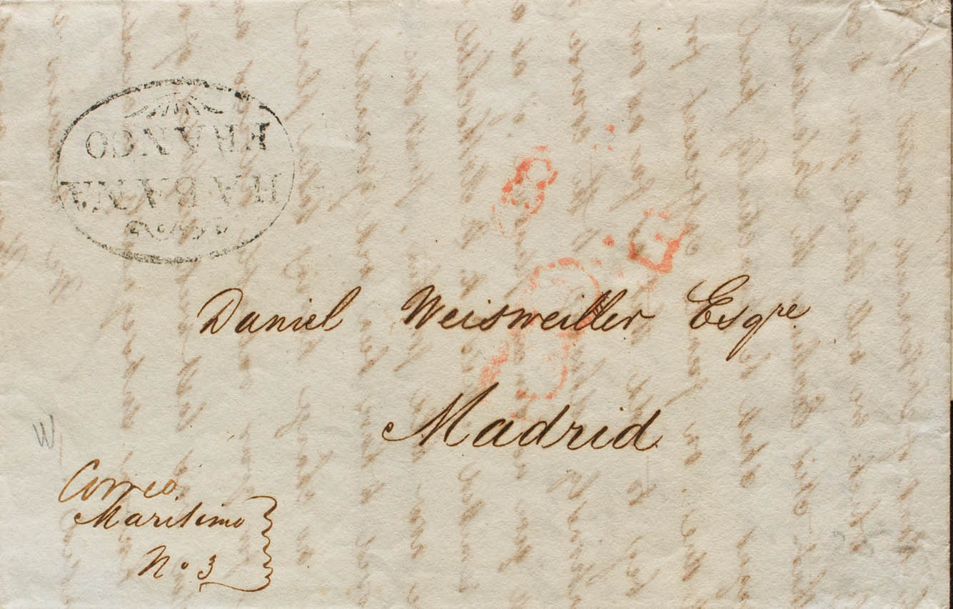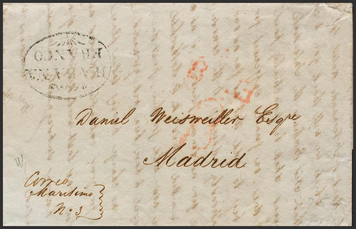(1837ca). LA HABANA a MADRID. Marca HABANA / FRANCO (P.E.18) edición 2004 (estampada nuevamente al dorso) y manuscrito "Correo Marítimo Nº3". MAGNIFICA.