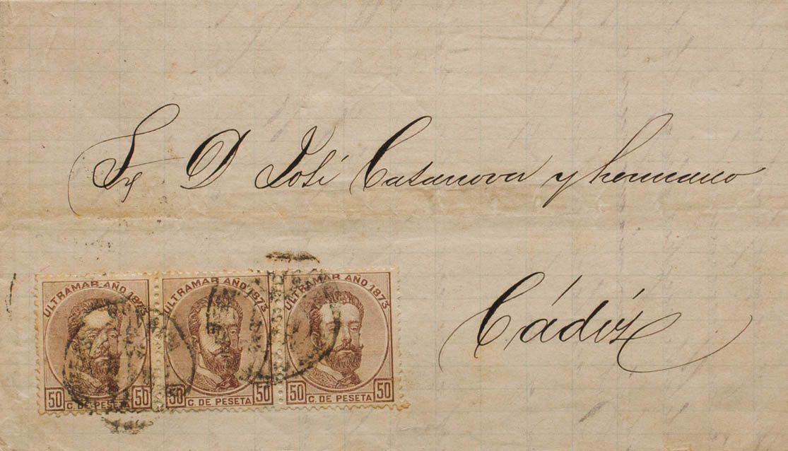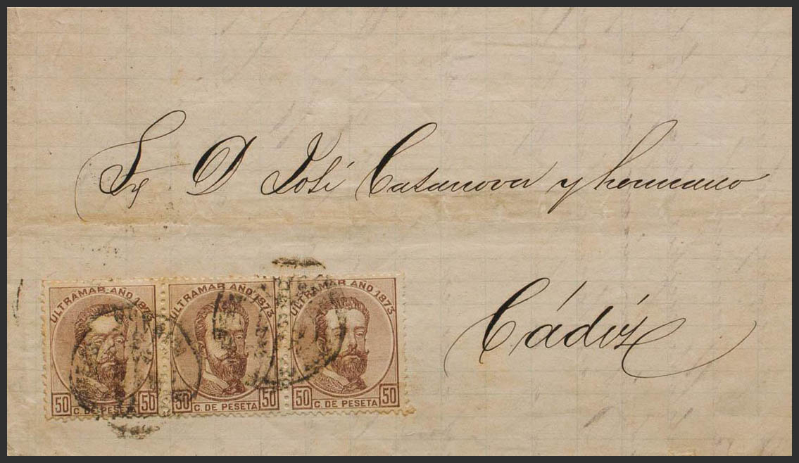 1873. 50 cts castaño, tira de tres. LA HABANA a CADIZ. MAGNIFICA Y RARISIMA COMBINACION DE FRANQUEO CON DESTINO A LA PENINSULA.