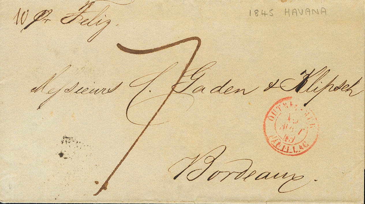 1845. LA HABANA a BURDEOS (FRANCIA). Fechador de tránsito OUTREMER / PAUILLAC, en rojo y porteo "7" manuscrito. MAGNIFICA.