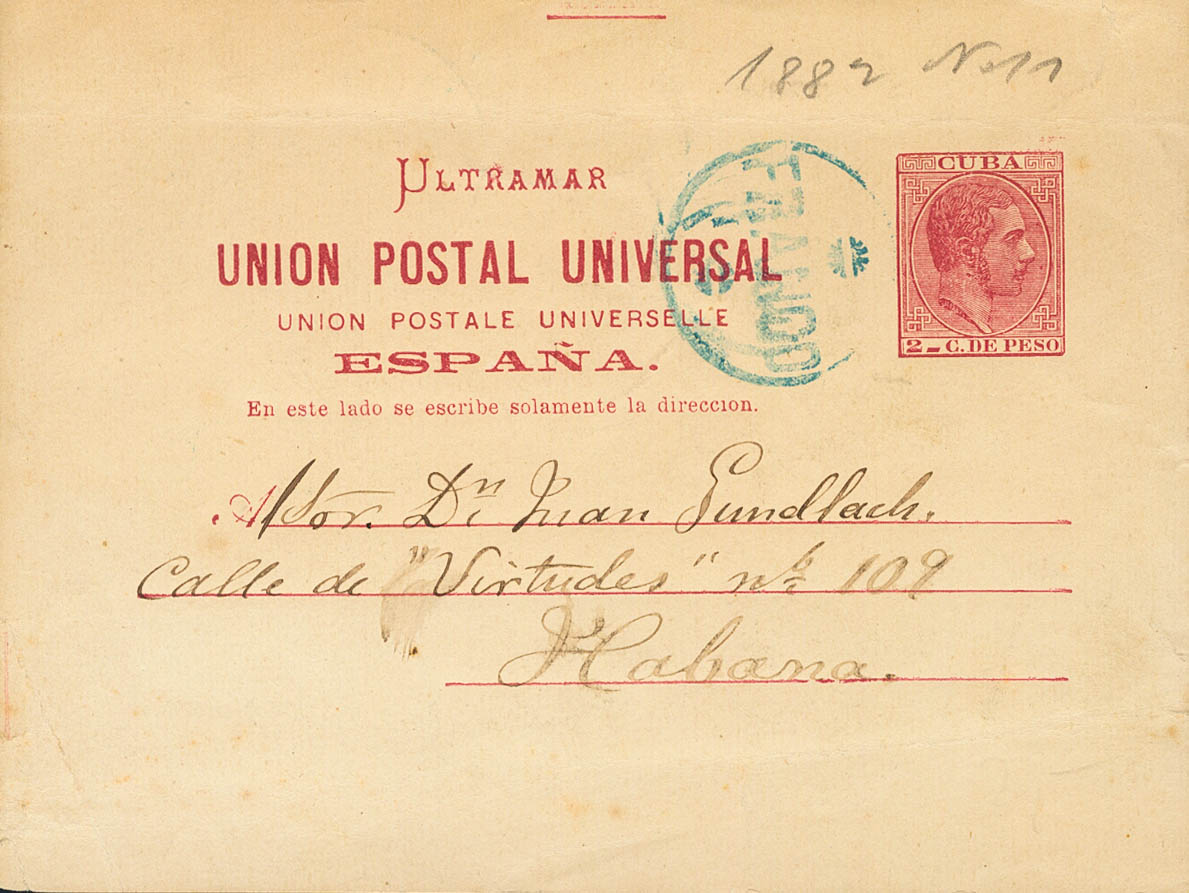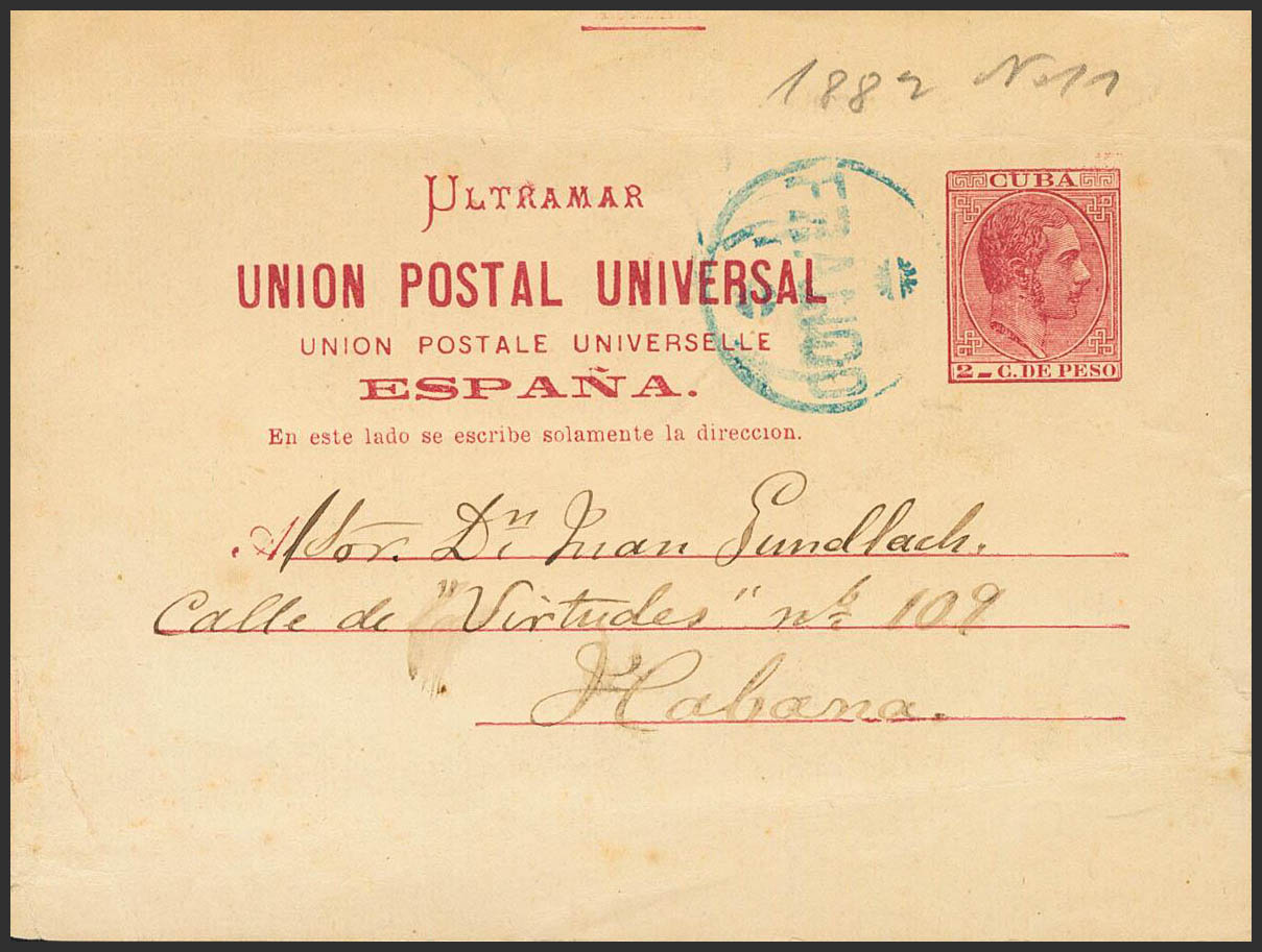 EP22. 1893. 2 ctvos carmín sobre Tarjeta Entero Postal de COTORRO (CUBA) a LA HABANA. Matasello FRANCO, en azul y al dorso llegada. MAGNIFICA Y MUY RARO ORIGEN DE UN ENTERO POSTAL CUBANO.