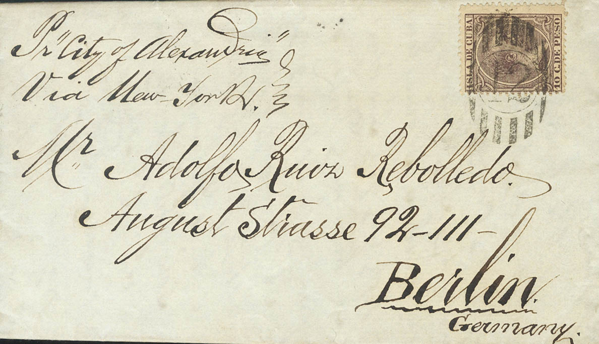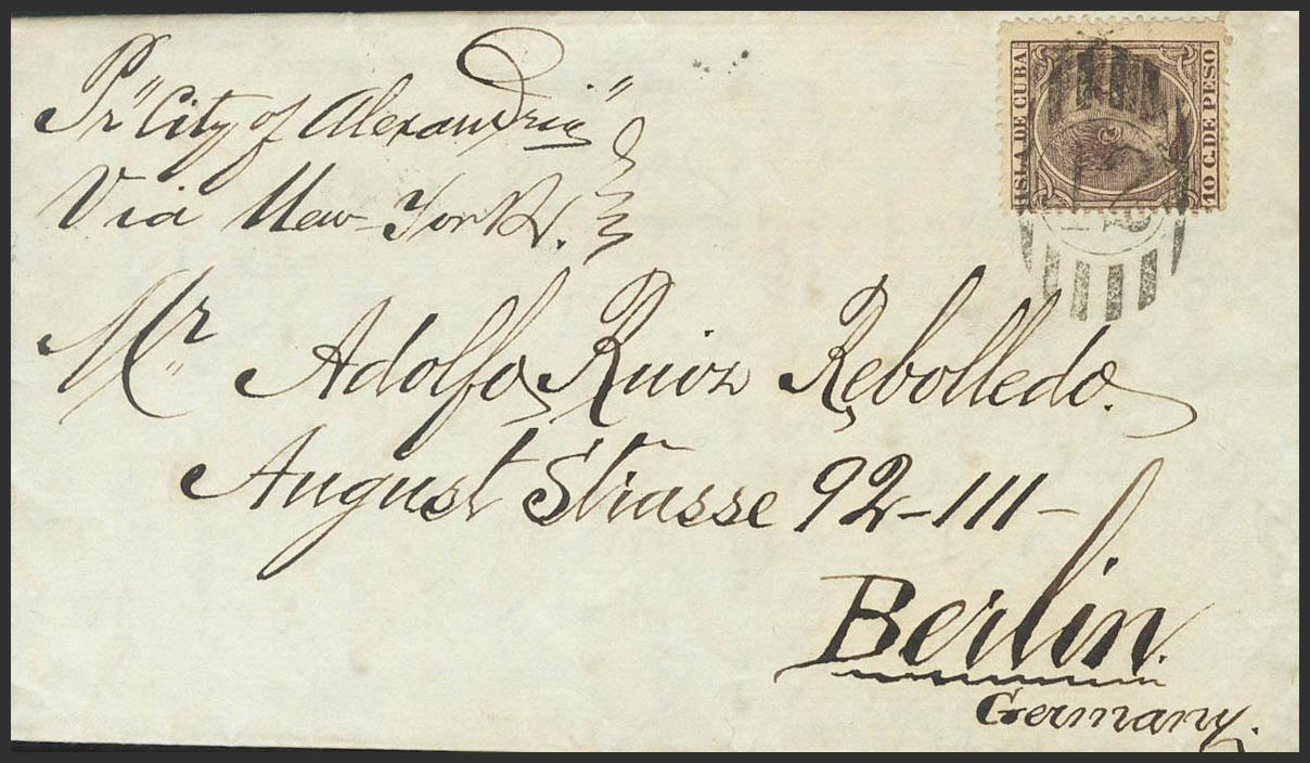 116. 1890. 10 ctvos castaño. LA HABANA a BERLIN (ALEMANIA). Matasello PARRILLA CON Nº12 y en el frente manuscrito "Por City of Alexandrie", "Vía New York", al dorso llegada. MAGNIFICA.