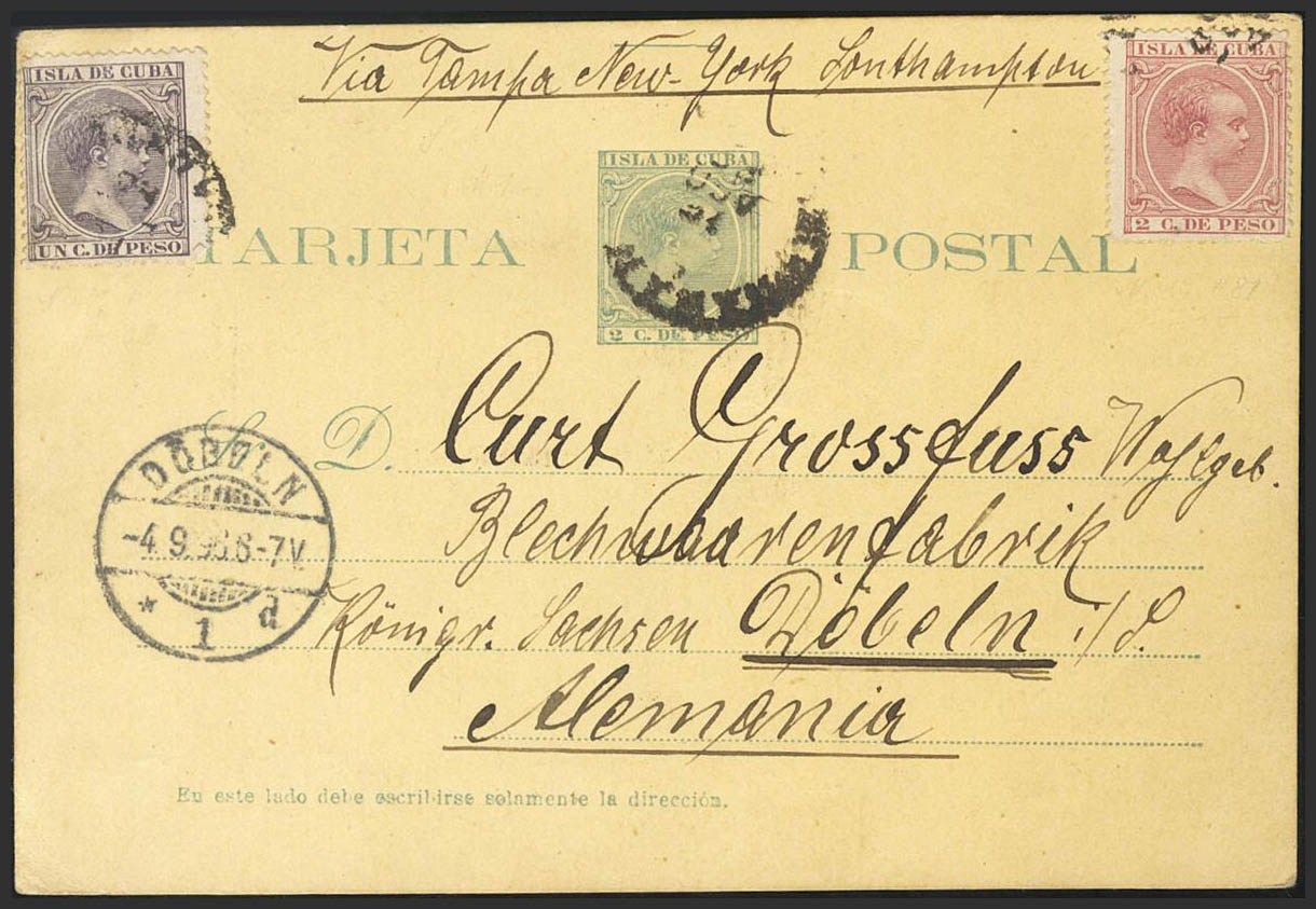 EP27A. 1896. 2 ctvos verde sobre Tarjeta Entero Postal de LA HABANA a DOBELN (ALEMANIA), con franqueo complementario de 1 ctvo violeta y 2 ctvos rosa, circulada vÃa Tampa, Nueva York y Southampton. En el frente llegada. MAGNIFICA Y EXTRAORDINARIAMENTE RARO FRANQUEO, SE CONOCE OTRO ENTERO GEMELO A ESTE REPRODUCIDO EN LA OBRA DE LAIZ. Cert. CEM.