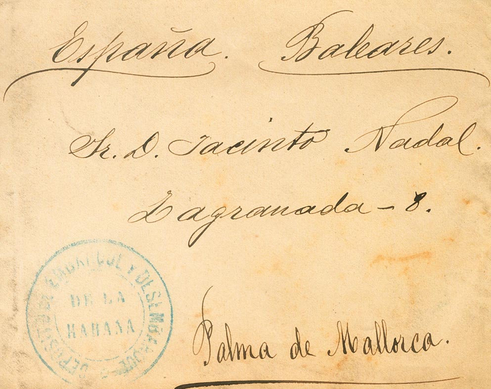 (1898ca). LA HABANA a PALMA DE MALLORCA. Marca DEPOSITO DE EMBARQUE Y DESEMBARQUE / DE LA / HABANA, en azul y al dorso llegada. MAGNIFICA Y RARA.