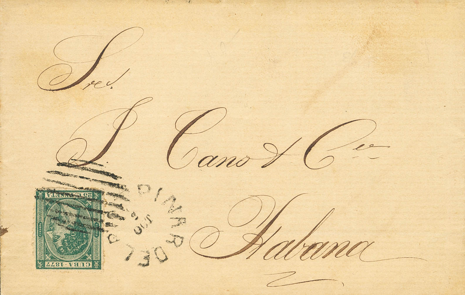 41. 1877. 25 cts verde. SAN JOSE a LA HABANA. Matasello PARRILLA OVAL DE NUEVE BARRAS y en el frente fechador especial PINAR DEL RIO. MAGNIFICA Y RARA, ES LA MISMA QUE APARECE REPRODUCIDA EN LA OBRA DE CARLOS ECHENAGUSIA. (Pág. 40)
