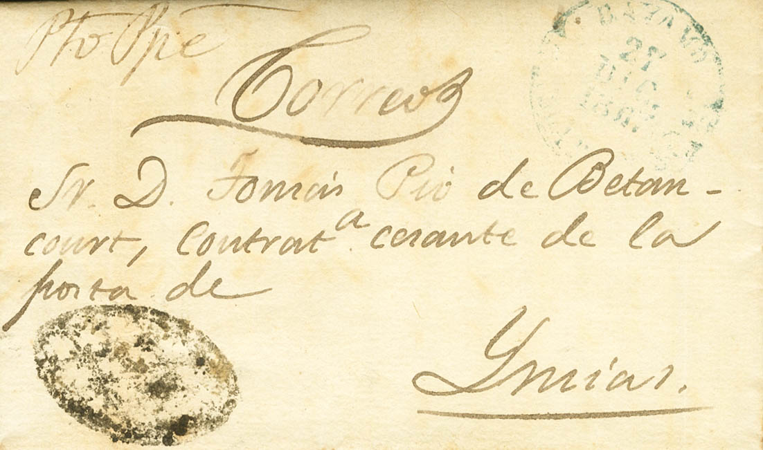 1857. BAYAMO a IMIAS. PARRILLA COLONIAL, aplicada para indicar que la carta circulaba franquiciada y baeza BAYAMO / ISLA DE CUBA, en azul. MAGNIFICA Y RARA.