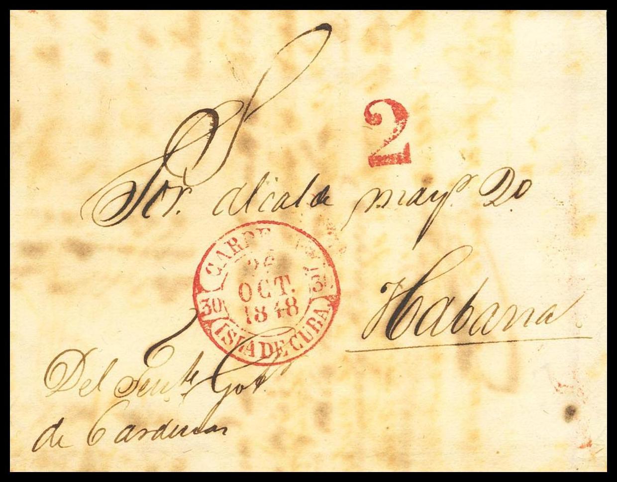 1848. CARDENAS a LA HABANA. Baeza CARDENAS / ISLA DE CUBA, en rojo. MAGNIFICA Y RARA.