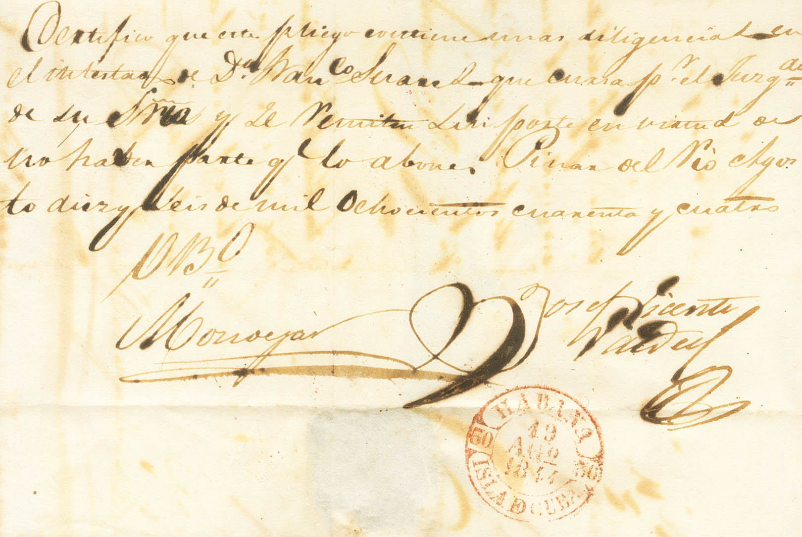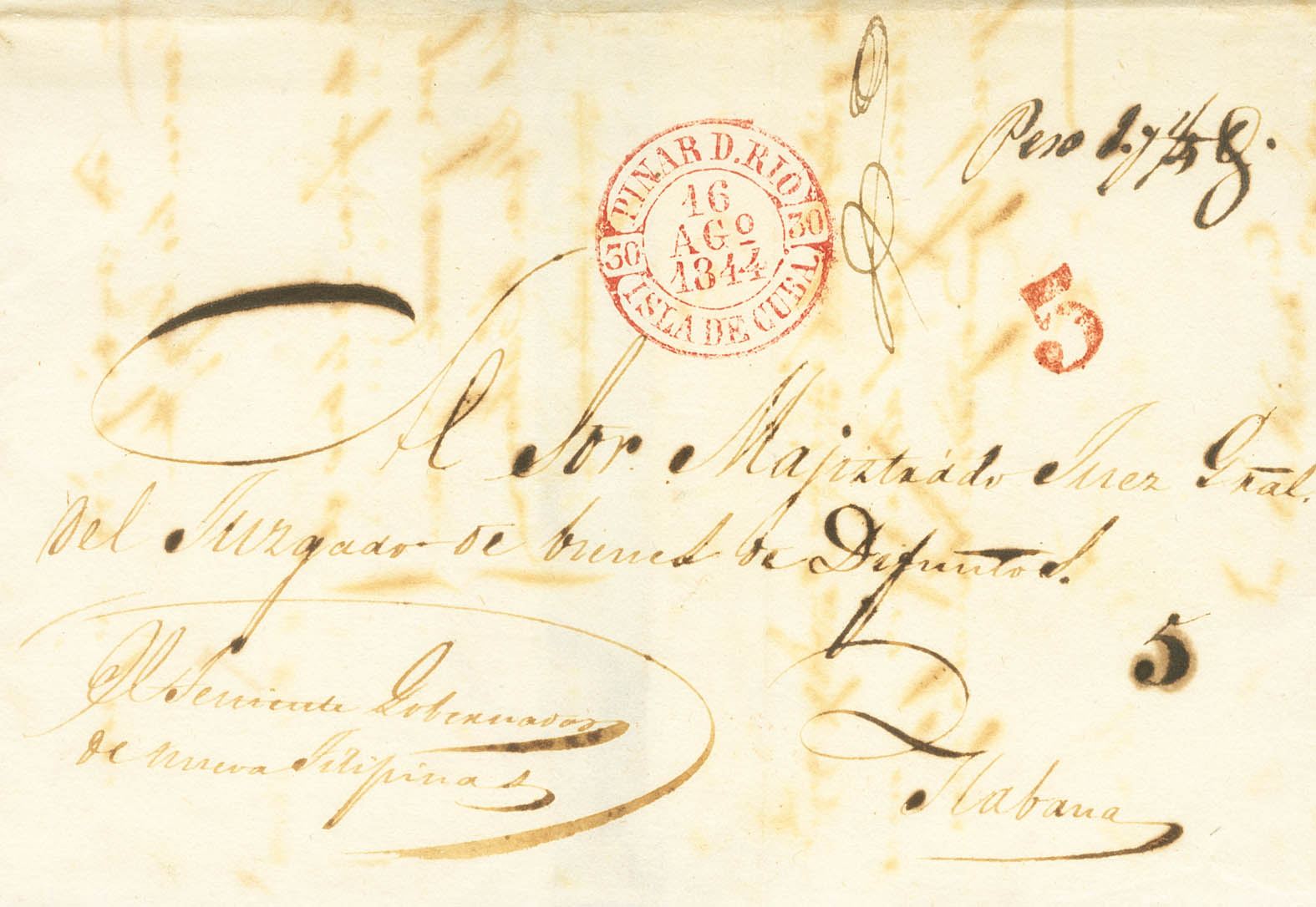 1844. PINAR DEL RIO (NUEVA FILIPINA) a LA HABANA. Baeza PINAR D.RIO / ISLA DE CUBA, en rojo. MAGNIFICA Y ESPECTACULAR ESTAMPACION Y MUY RARA.