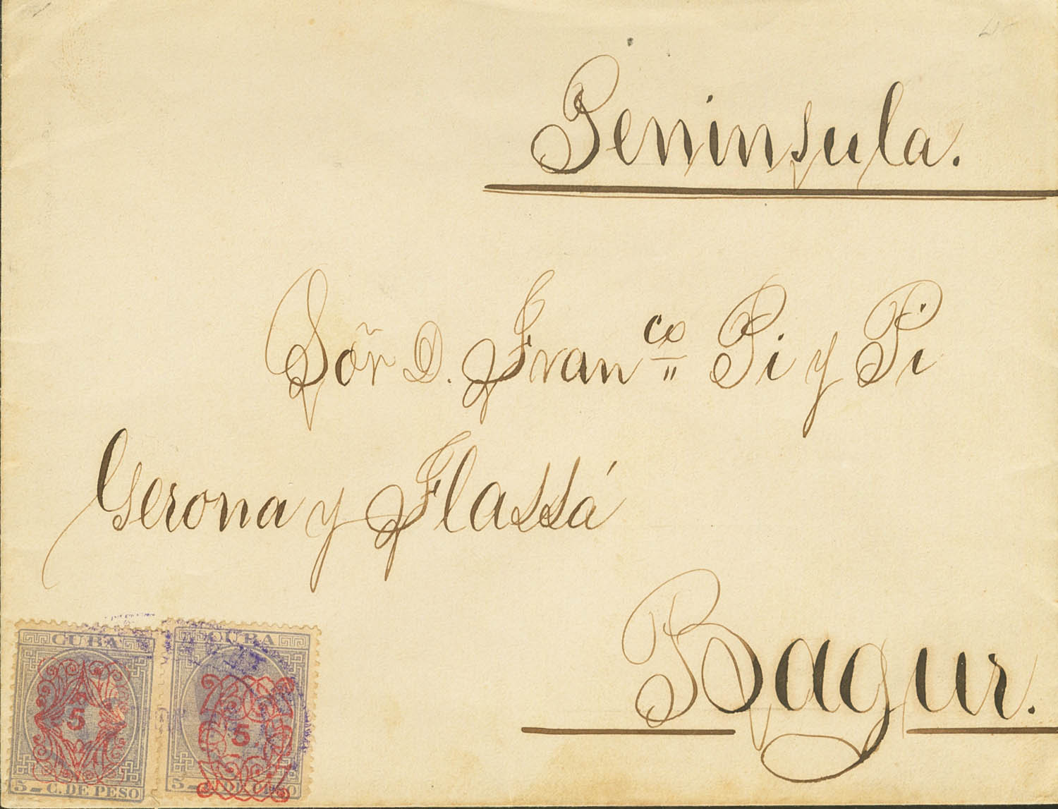 77, 80A. 1883. 5 cts sobre 5 cts, dos sellos (Tipo b y c). Dirigida a BAGUR (GERONA). Al dorso llegada. MAGNIFICA Y RARISIMO USO DE LA EMISION DE ARAÑITAS. Cert. COMEX.