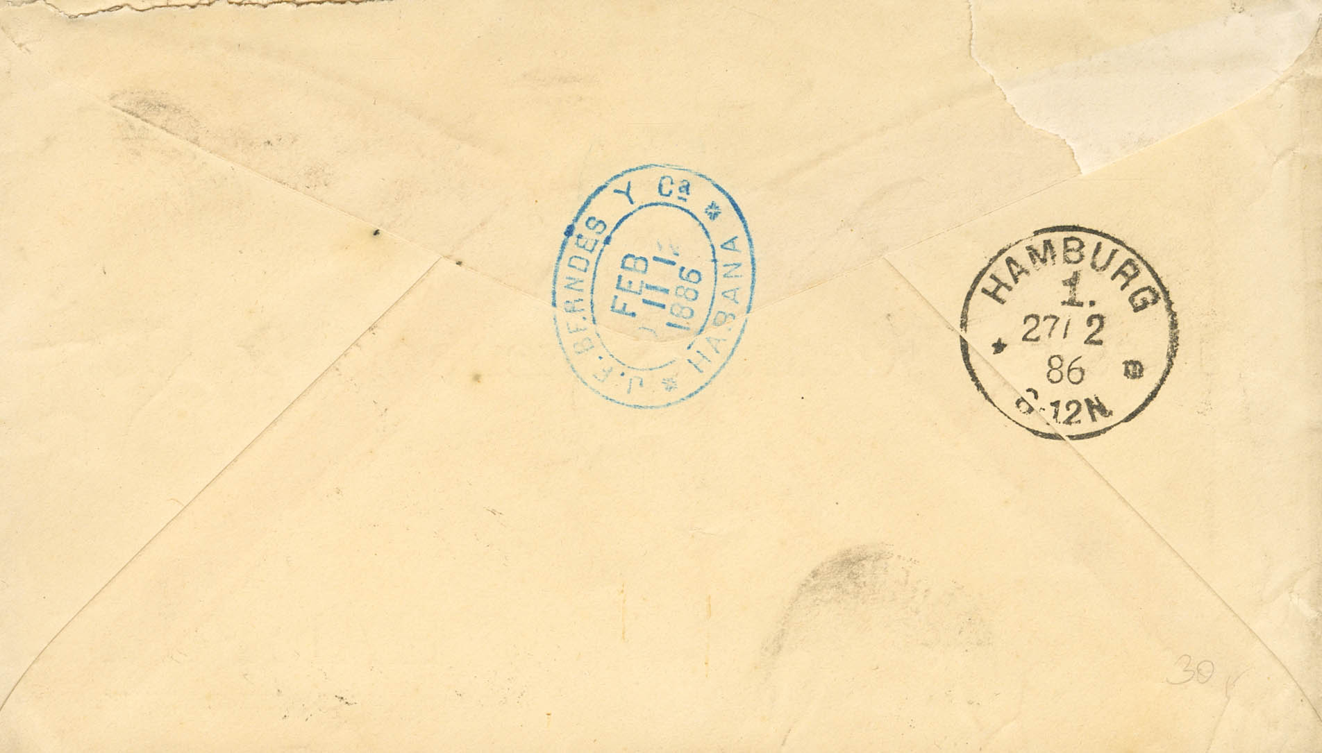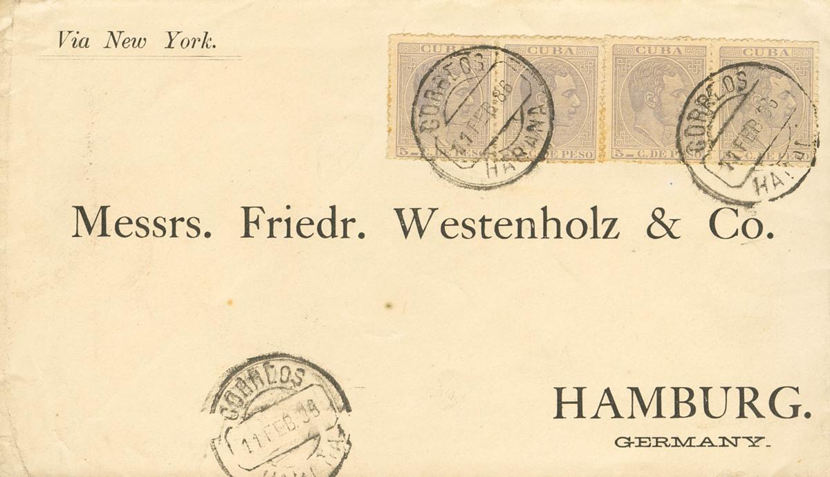 100(4). 1886. 5 ctvos azul gris, cuatro sellos. LA HABANA a HAMBURGO (ALEMANIA), circulada vÃa Nueva York. Al dorso llegada. MAGNIFICA.