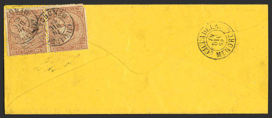 Ant. 16(2). 1869. 10 cts castaño, pareja, franqueada al dorso. CUBA a CIUDADELA. Matasello CIUDADELA / MENORCA, a la llegada. MAGNIFICA.