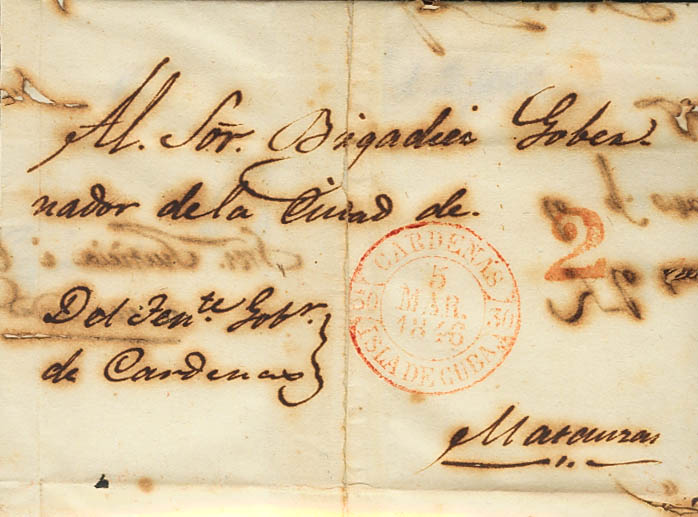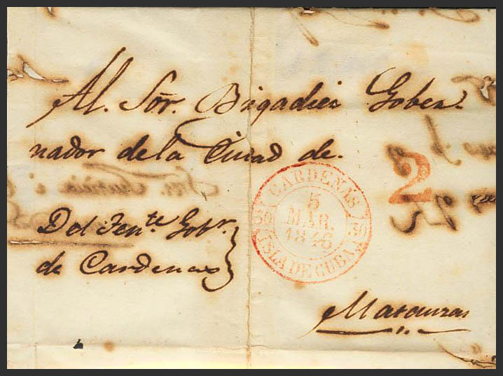 1846. CARDENAS a MATANZAS. Baeza CARDENAS / ISLA DE CUBA, en rojo. MAGNIFICA Y RARA.