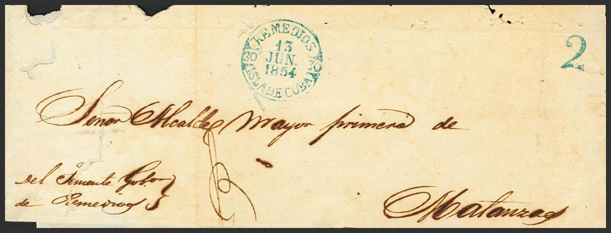 1854. SAN JUAN DE LOS REMEDIOS a MATANZAS. Baeza REMEDIOS / ISLA DE CUBA, en azul. BONITA Y RARA.
