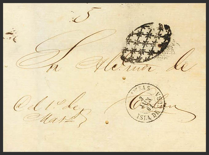 1861. MATANZAS a COLON. Marca PARRILLA COLONIAL, indicando que la carta circulaba libre de porte. MAGNIFICA.