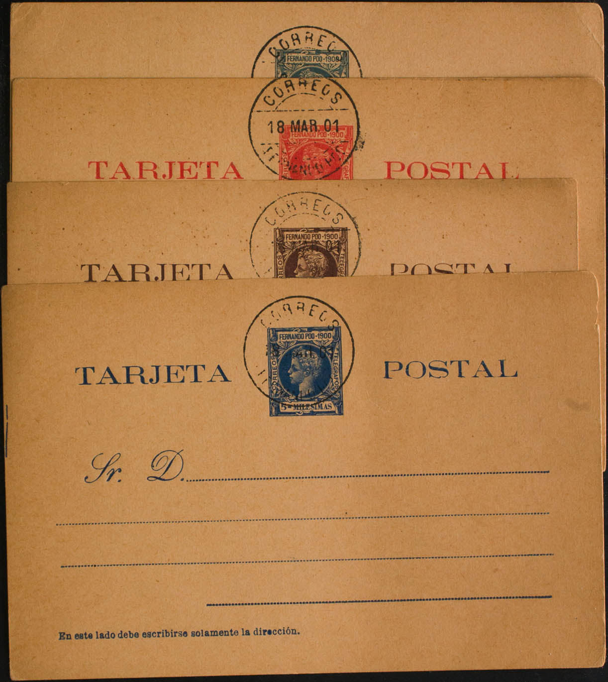 EP9/12. 1899. Serie completa, cuatro Tarjetas Entero Postales con matasellos (filatélicos) CORREOS / FERNANDO POO. MAGNIFICAS. Edifil 2012: 960 Euros