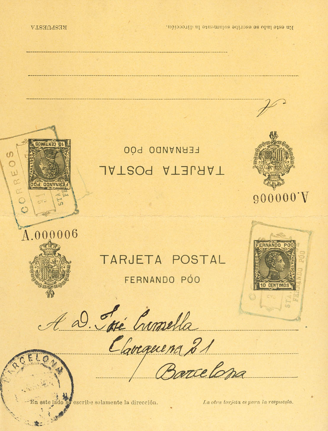 EP22. 1907. 10 cts + 10 cts verde negro sobre Tarjeta Entero Postal, de ida y vuelta. Matasello filatélico CORREOS / STA ISABEL DE / FERNANDO POO. Edifil 2018: 300 Euros