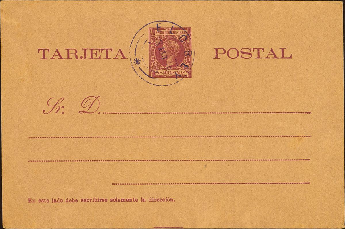 EP1. 1899. 5 mils carmín sobre Tarjeta Entero Postal. Matasello (de favor) ELOBEY. MAGNIFICA Y RARISIMA, SOLO RESEÑADA LA TARJETA DE 1 CTVO CON ESTE MATASELLO DE CARACTER FILATELICO.