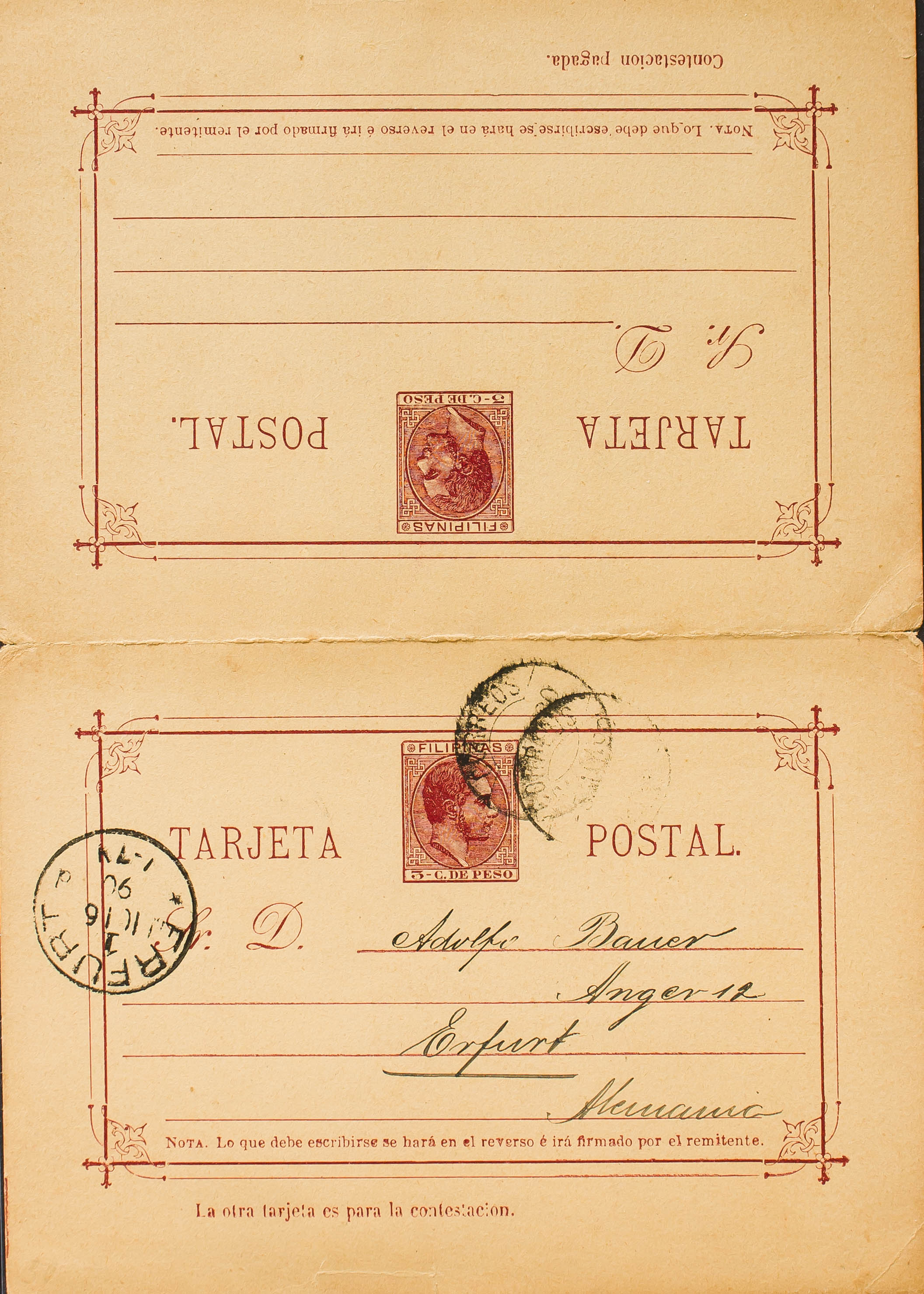 EP5. 1890. 5 cts + 5 ctvs carmín sobre Tarjeta Entero Postal de ida y vuelta, la ida circulada de MANILA a ERFURT (ALEMANIA). En el frente llegada. MAGNIFICA Y RARISIMA.