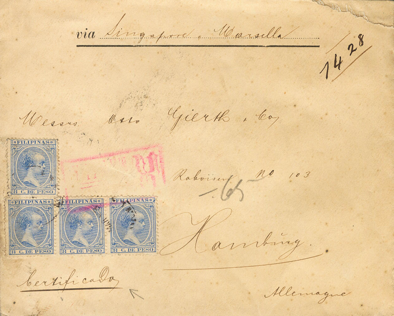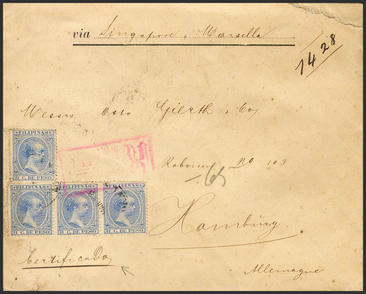 98. 1893. 8 ctvos ultramar, cuatro sellos. Certificado de MANILA a HAMBURGO (ALEMANIA). Al dorso llegada. MAGNIFICA Y MUY RARA.
