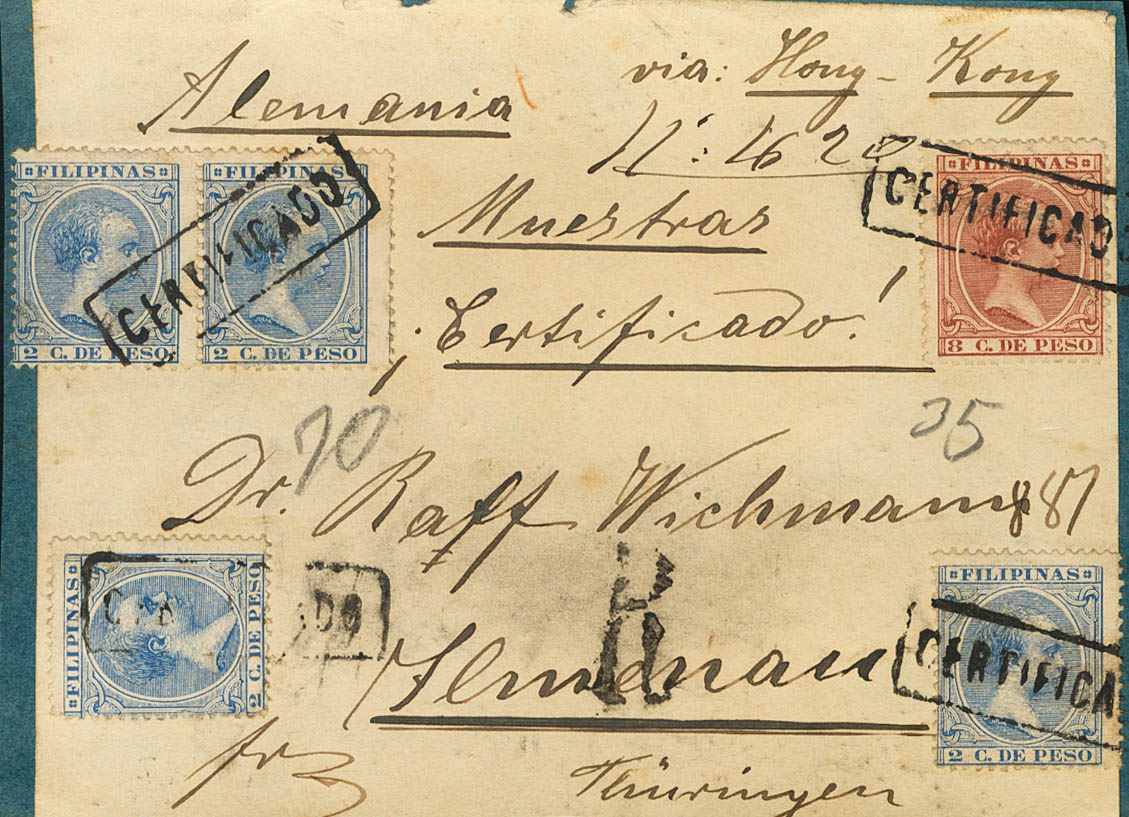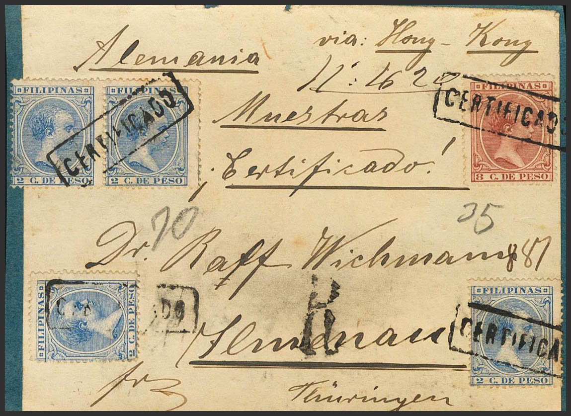 123(4), 113. (1896ca). 2 ctvos azul ultramar, cuatro sellos y 8 ctvos castaño rojo. Frontal de Certificado dirigido a ILMENAU (ALEMANIA). Matasello CERTIFICADO y en el frente manuscrito "Vía Hong Kong". MAGNIFICO Y RARISIMO.