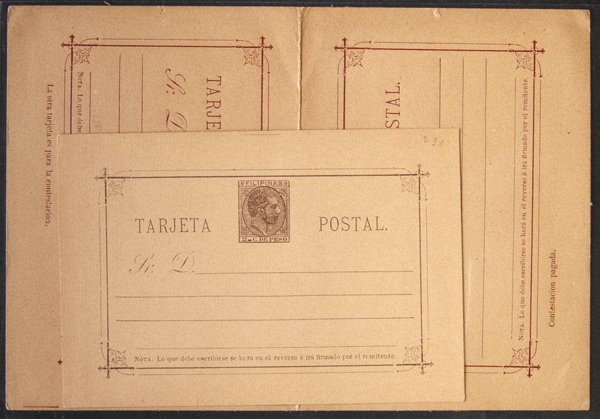 (★) EP4/5. 1889. 2 cts castaño sobre Tarjeta Entero Postal y 3 cts + 3 cts carmín sobre Tarjeta Entero Postal, de ida y vuelta. MAGNIFICAS. Edifil 2018: 91 Euros