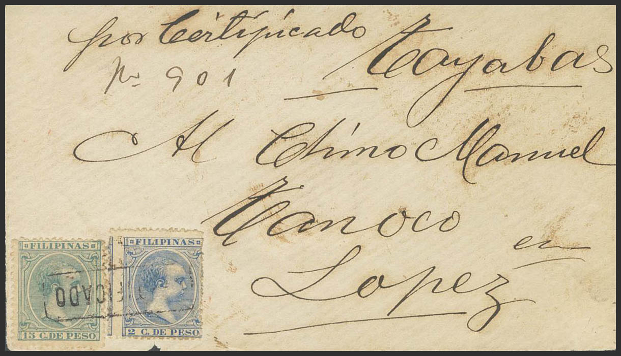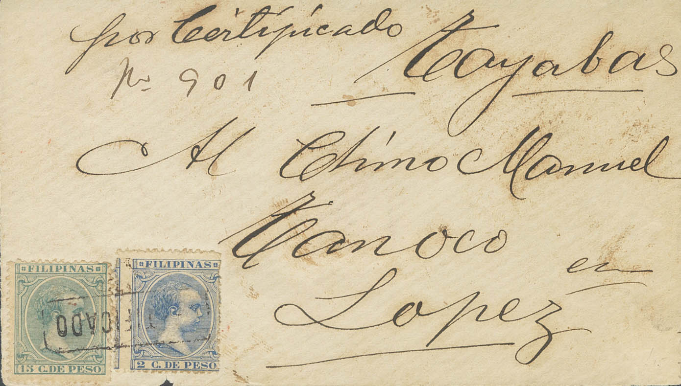 123, 127. (1896ca). 2 ctvos azul y 15 ctvos verde. Certificado dirigido a TAYABAS. Matasello lineal CERTIFICADO, en negro y al dorso firma del destinatario, además de tampón y anotación con caracteres chinos. MAGNIFICA Y RARISIMA. Cert. CEM.