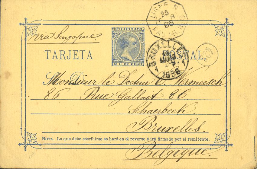 Filipinas. Entero Postal. Entero Postal 10. Dirigida a BELGICA, por los vapores franceses.