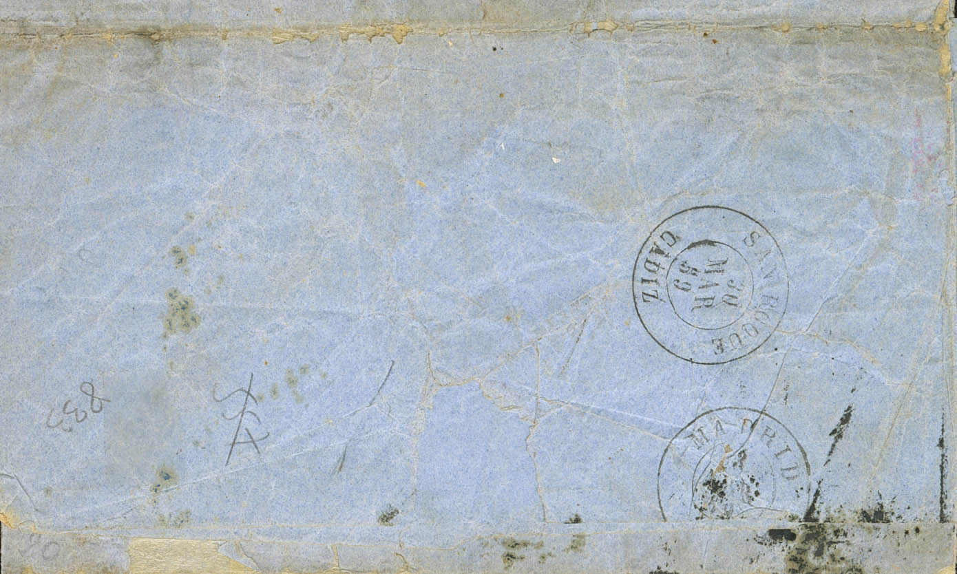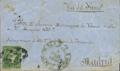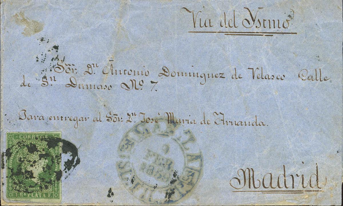 6a. 1859. 1 real verde. MANILA a MADRID. Matasello PARRILLA COLONIAL y en el frente baeza MANILA / ISS.FILIPS. MAGNIFICA.