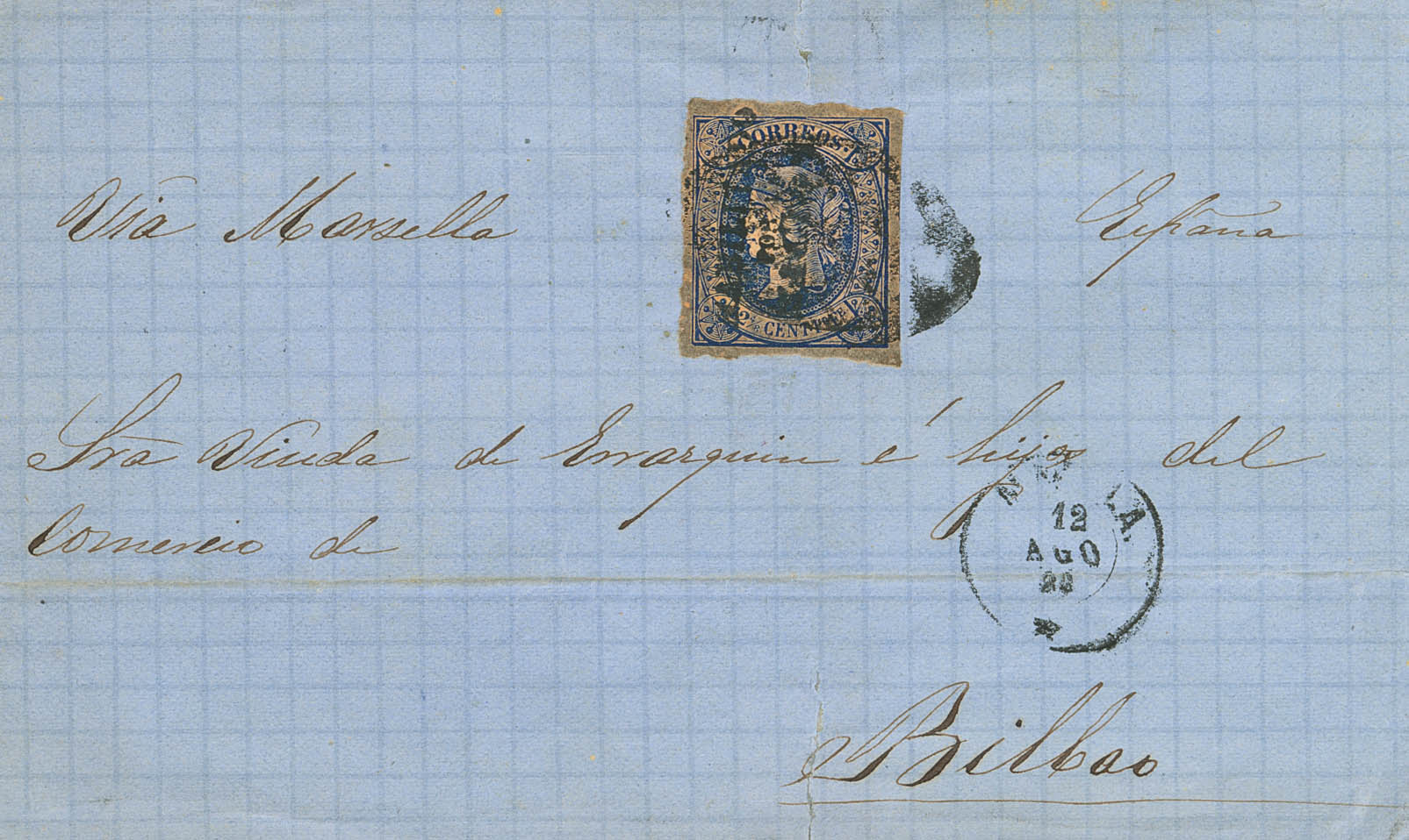 20O. 1869. 12 4/8 cts azul HABILITADO / POR LA / NACION. MANILA a BILBAO. MAGNIFICA Y RARA.