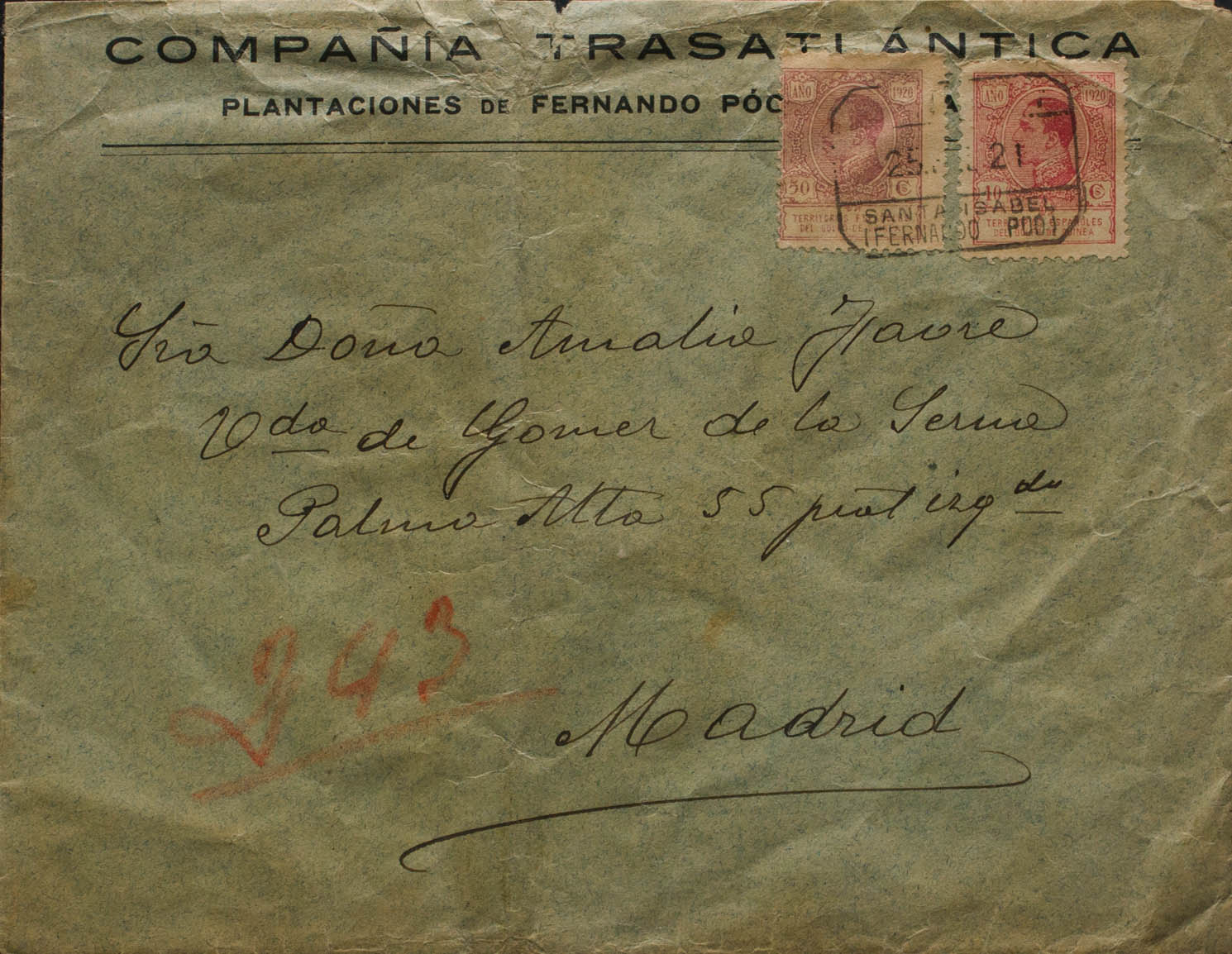 144, 150. 1921. 50 cts lila y 10 cts violeta. Certificado de SANTA ISABEL a MADRID. Al dorso llegada. MAGNIFICA Y RARA.