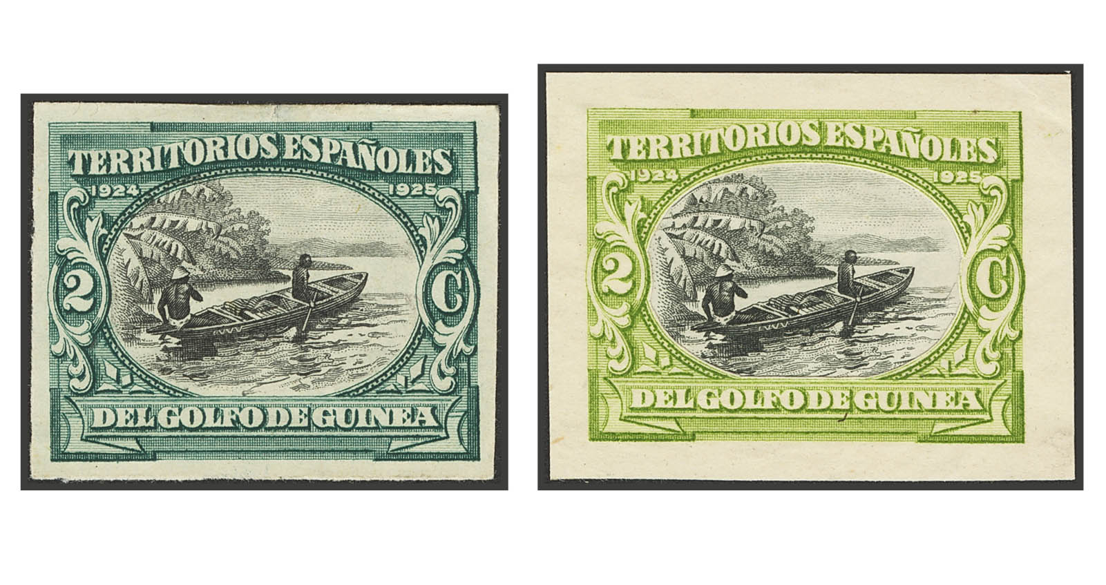 (★)1923. 2 cts verde oscuro y negro y 2 cts verde amarillo y negro. ENSAYOS DE COLOR DE UN DISEÑO NO ADOPTADO, realizados por el grabador Camilo Delhom. MAGNIFICOS Y MUY RAROS.