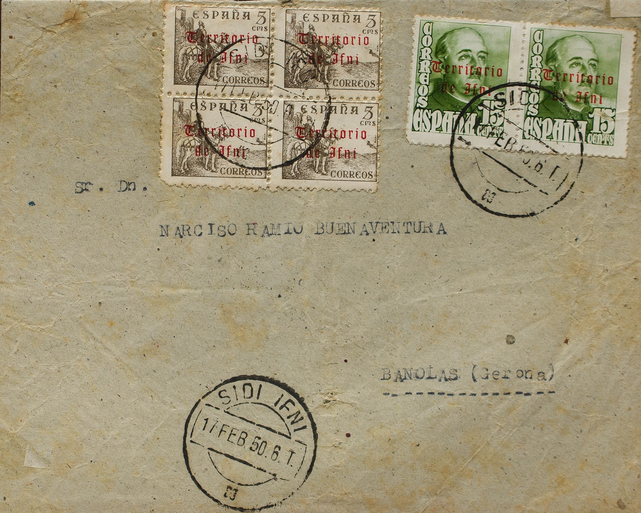39(4), 41(2). 1950. 5 cts castaño, bloque de cuatro y 15 cts verde, pareja. SIDI-IFNI a BAÑOLAS (GERONA). Al dorso llegada. MAGNIFICA Y RARA.