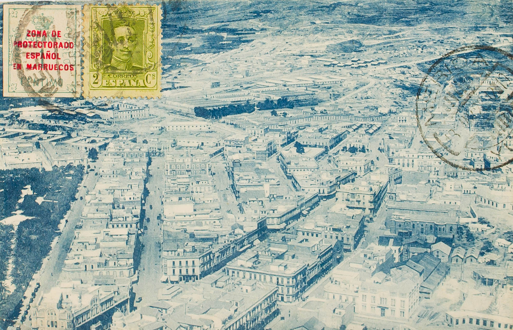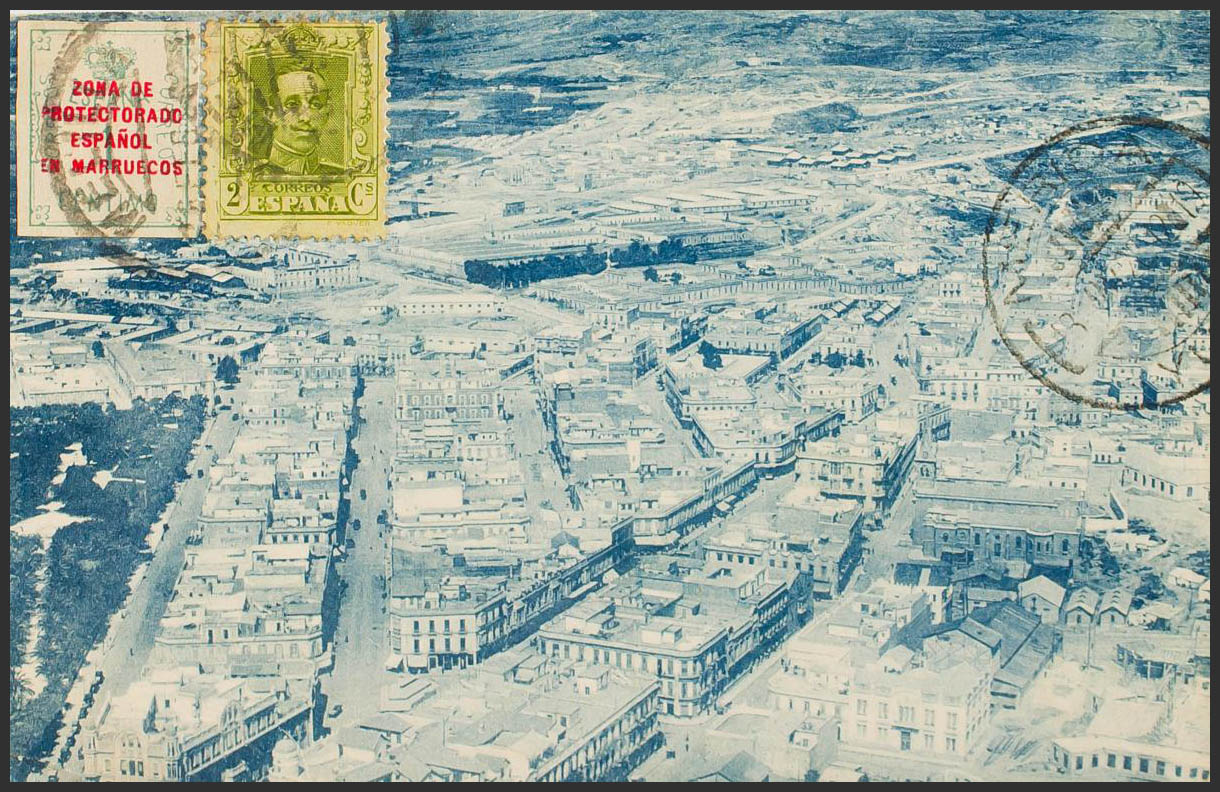 74. 1928. 1 cts verde y sello de España de 2 cts oliva (Vaquer). Tarjeta Postal de MELILLA a MERIDA (MEXICO). MAGNIFICA E INUSUAL FRANQUEO DE IMPRESOS MIXTO MARRUECOS-ESPAÑA.