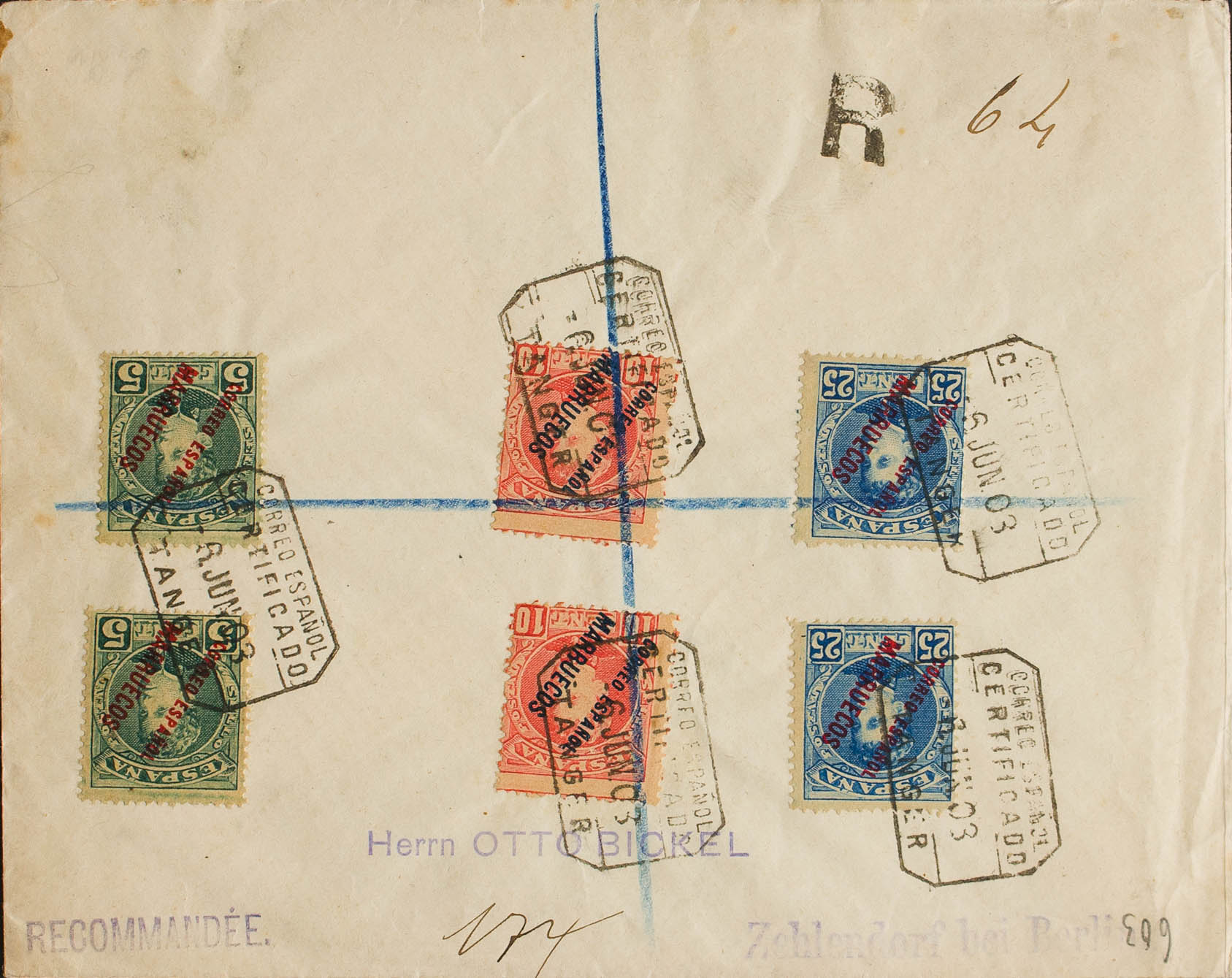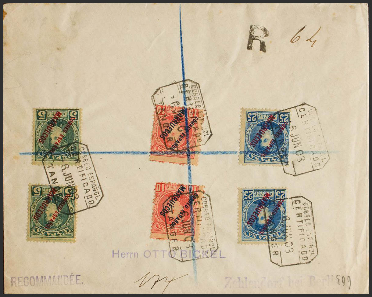 3(2), 4(2), 7(2). 1903. 5 cts verde, dos sellos, 10 cts rojo, dos sellos y 25 cts azul, dos sellos. Certificado de TANGER a BERLIN (ALEMANIA). Al dorso llegada. MAGNIFICA.