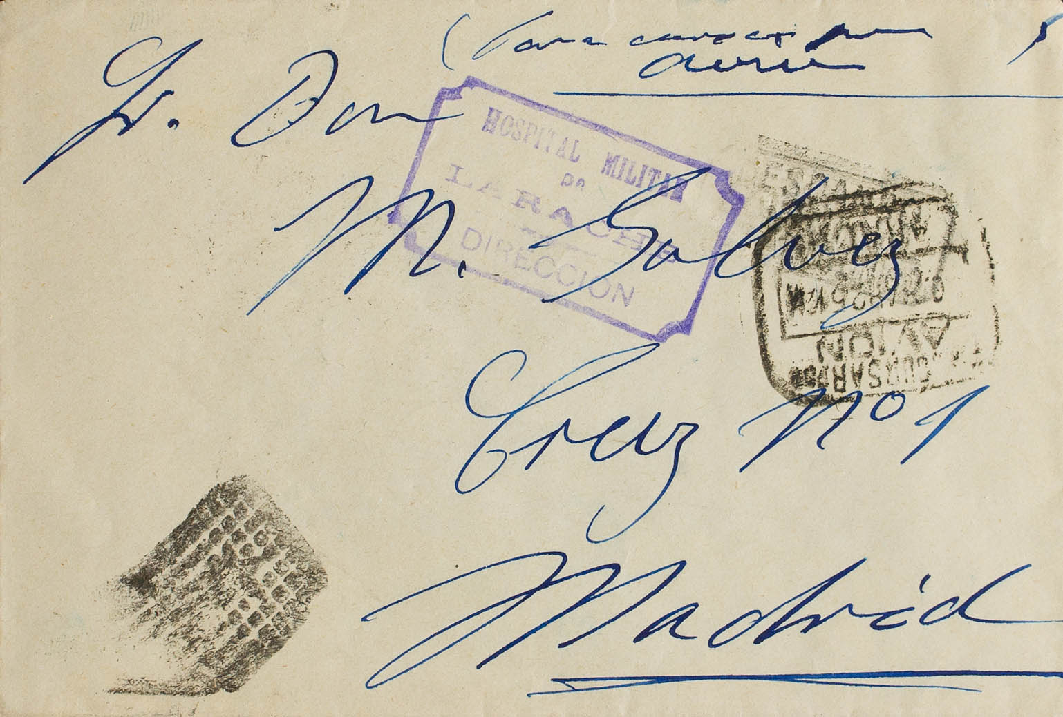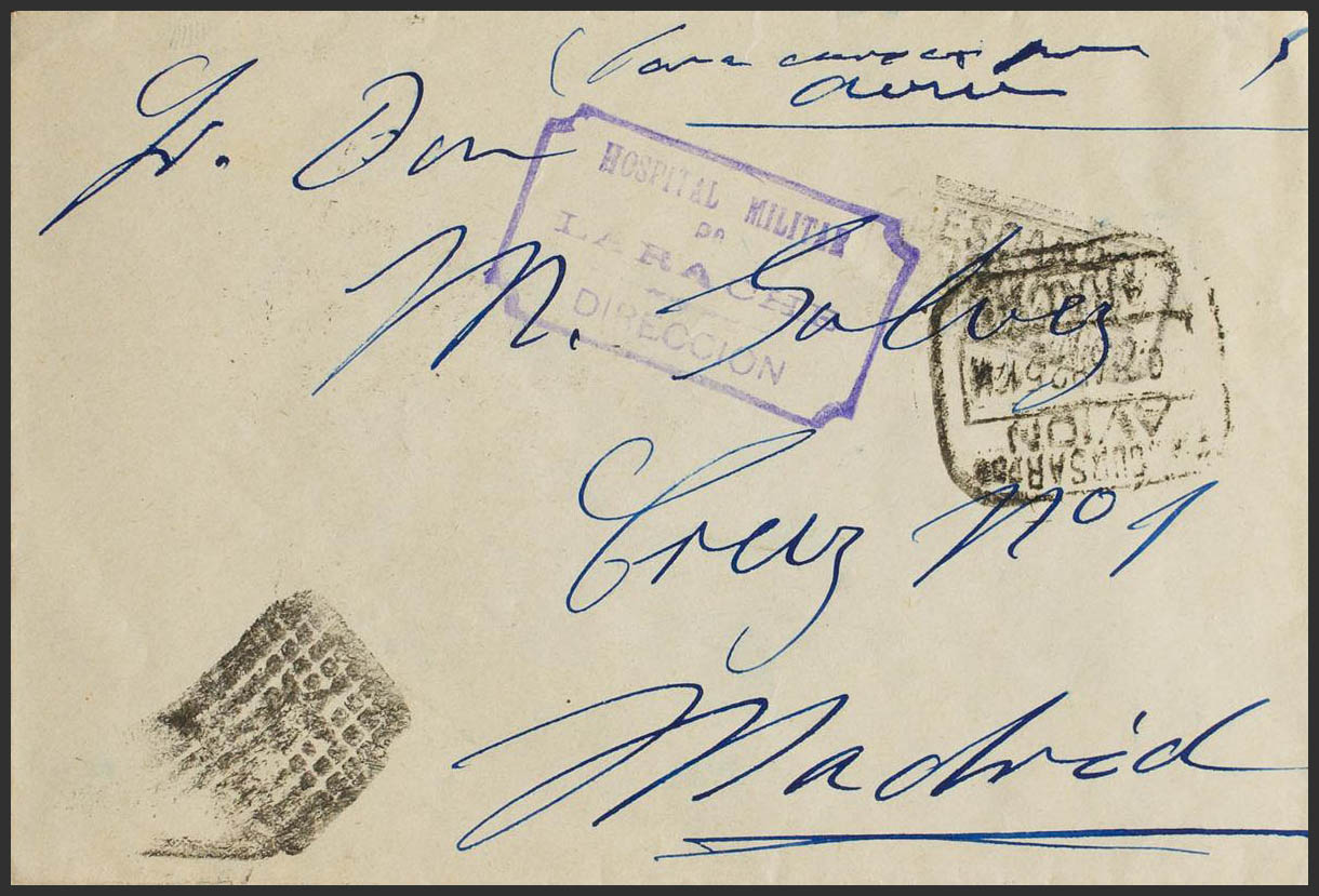 1925. Correo Aéreo de LARACHE a MADRID. Marca HOSPITAL MILITAR / DE / LARACHE / DIRECCION, en violeta y marca "Rombo de Puntos" (antiguo matasello), indicando la franquicia y al dorso llegada. MAGNIFICA Y RARA.
