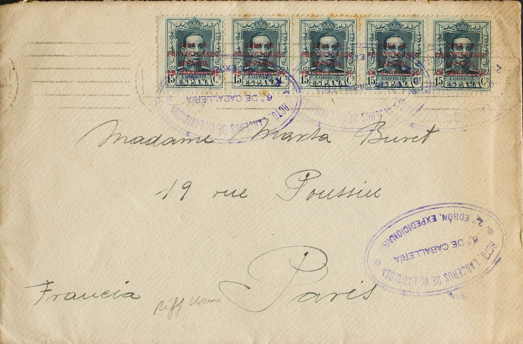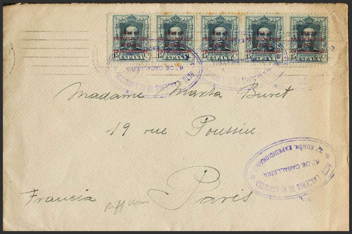 84(5). 1925. 15 cts verde azulado, cinco sellos. Dirigida a PARIS (FRANCIA). Matasello RGTO. LANCEROS DE VILLAVICIOSA / *6º DE CABALLERIA* / 2º EDRON. EXPEDICIONARIO. MAGNIFICA Y RARA.