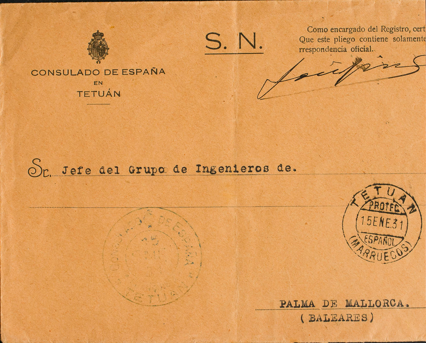 1931. TETUAN a PALMA DE MALLORCA. Marca de franquicia CONSULADO DE ESPAÑA / TETUAN. MAGNIFICA.