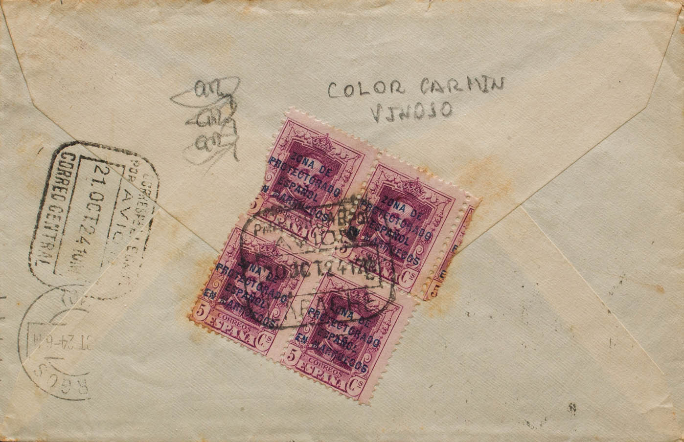 82a(4). 1924. 5 cts carmÃn vinoso, bloque de cuatro, al dorso (un sello con defectito, sin importancia). Certificado de LARACHE a BURGOS. Al dorso llegada. MAGNIFICA Y RARISIMA TONALIDAD SOBRE CARTA, NO CATALOGADOS EN USADO, OBVIAMENTE TAMPOCO SOBRE CARTA. (como sellos nuevos + 600 Euros)