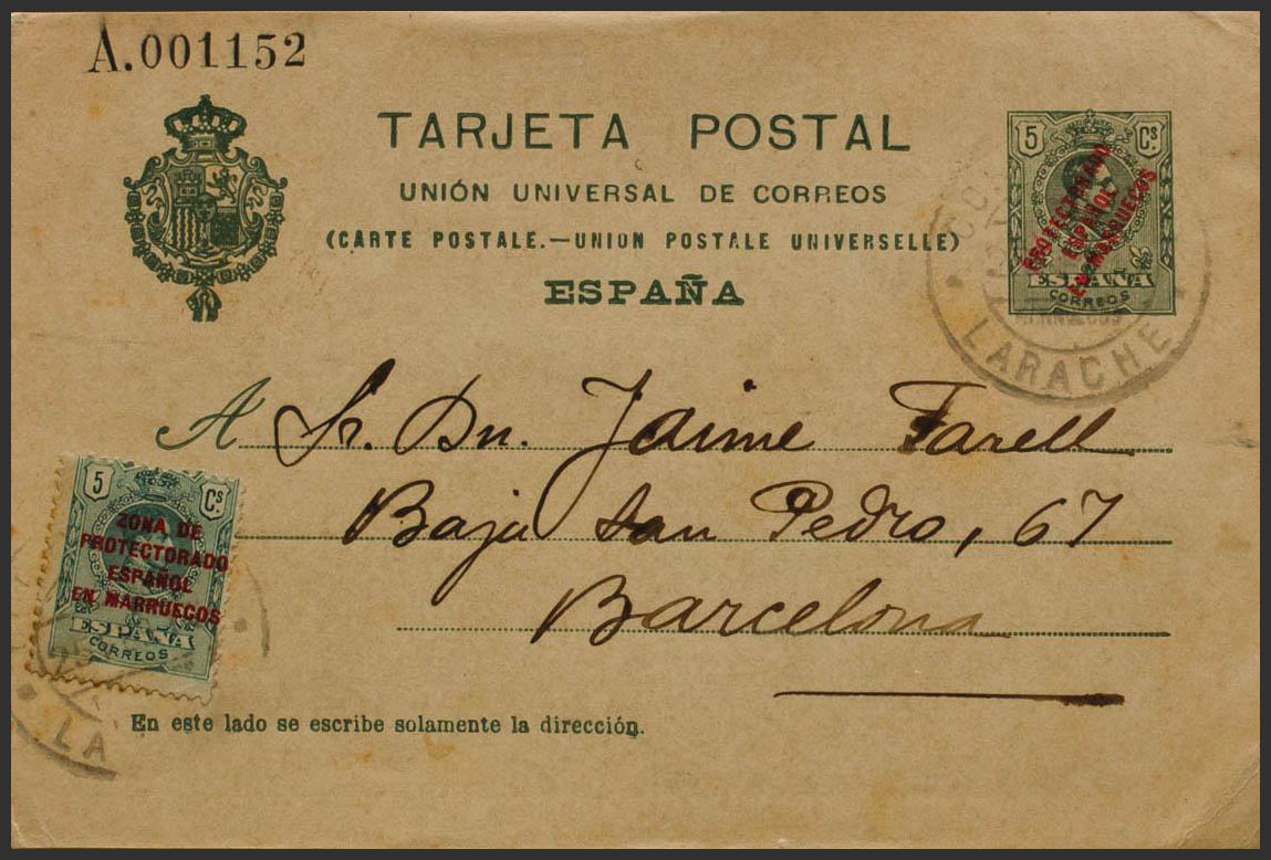 EP9. 1917. 5 cts verde sobre Tarjeta Entero Postal de LARACHE a BARCELONA, con franqueo complementario de 5 cts verde. MAGNIFICO Y RARO VERDADERAMENTE CIRCULADO.