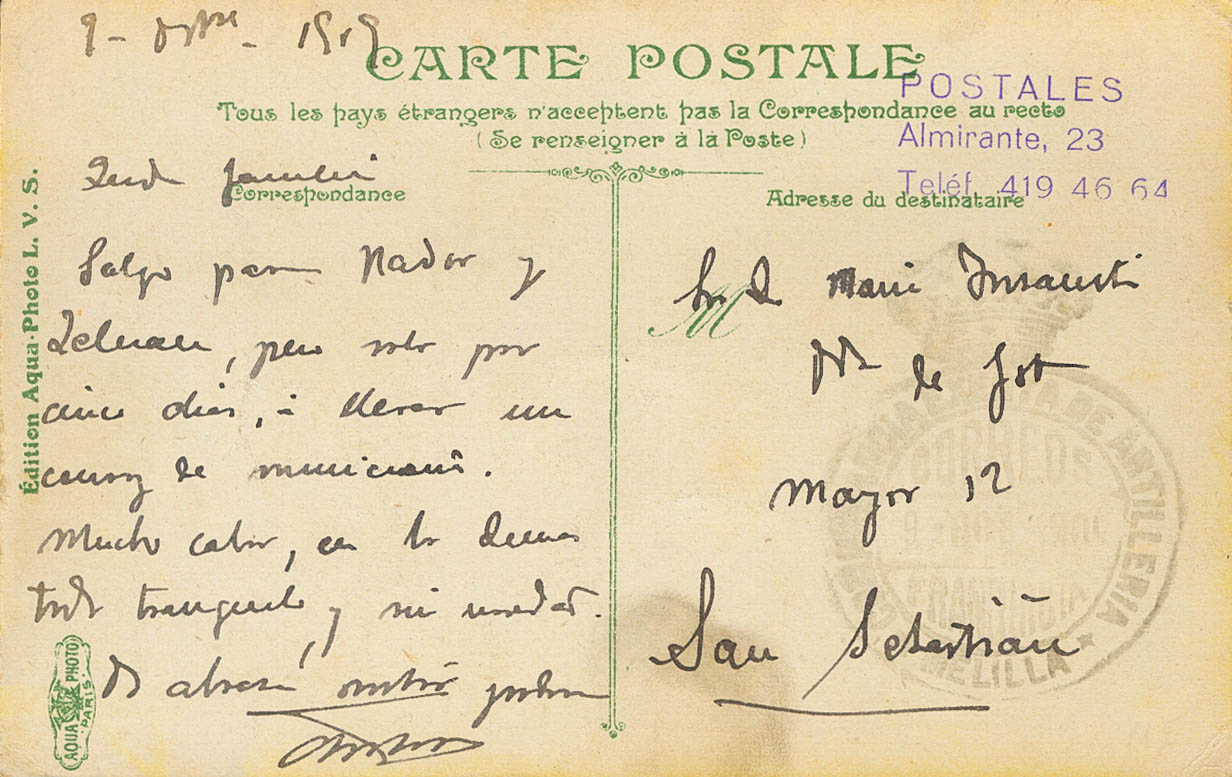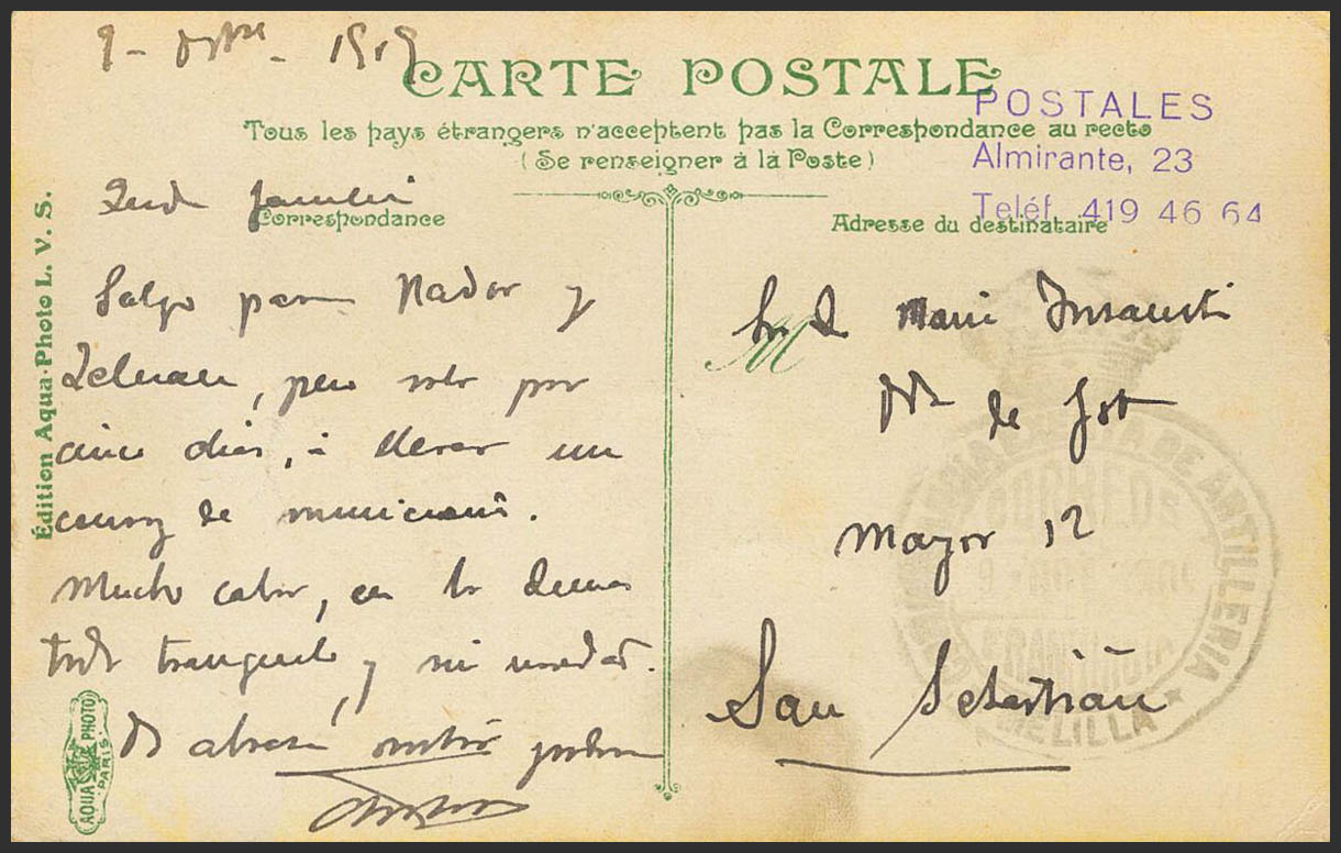 1919. Tarjeta Postal Ilustrada de MELILLA a SAN SEBASTIAN. Marca de franquicia COMANDANCIA EXENTA DE ARTILLERIA / MELILLA. MAGNIFICA.